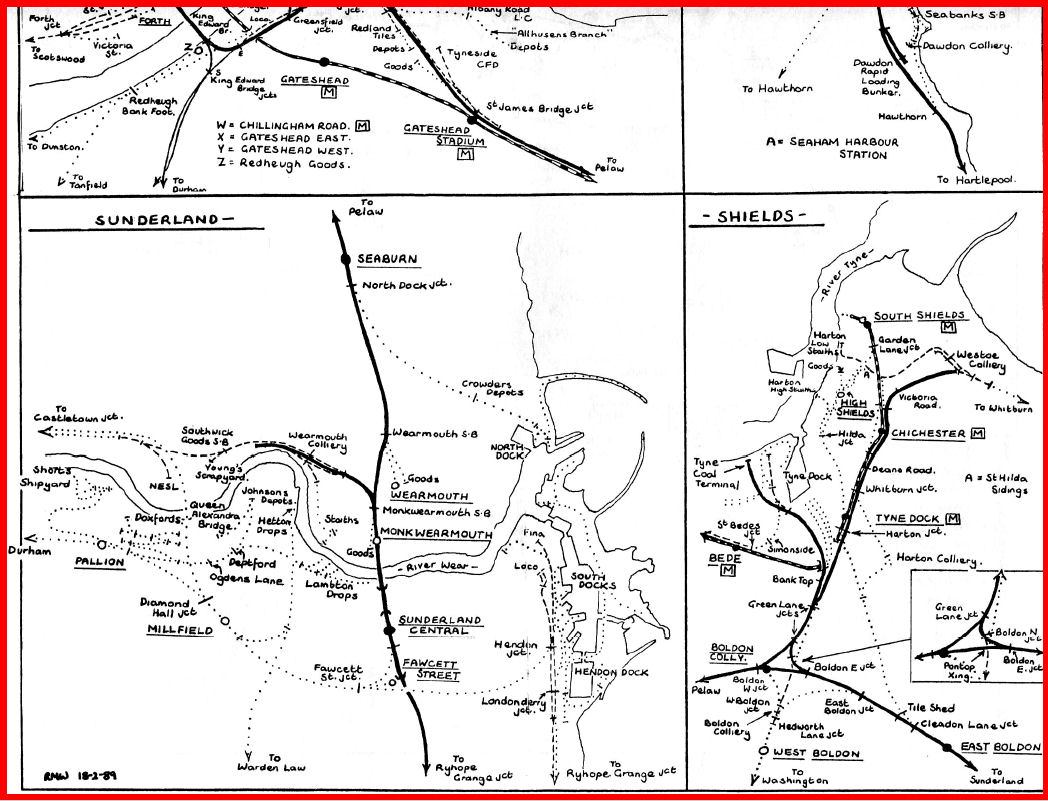Returning from Westoe to Green Lane Jn, the then new curve, opened 19 May 1985, was taken to Boldon East Jn, forming a triangle here. The DMU ran to Monkwearmouth before reversing and taking the short branch to Wearmouth Colliery (closed in 1994), where a point just short of the first overbridge beyond the colliery was reached. Running through Sunderland to Ryhope Grange Jn, the much longer branch to Hawthorn Preparation Plant was taken to just short of the loading bunker. Coal continued to be wound here from Murton Colliery until it closed two years later in 1991.