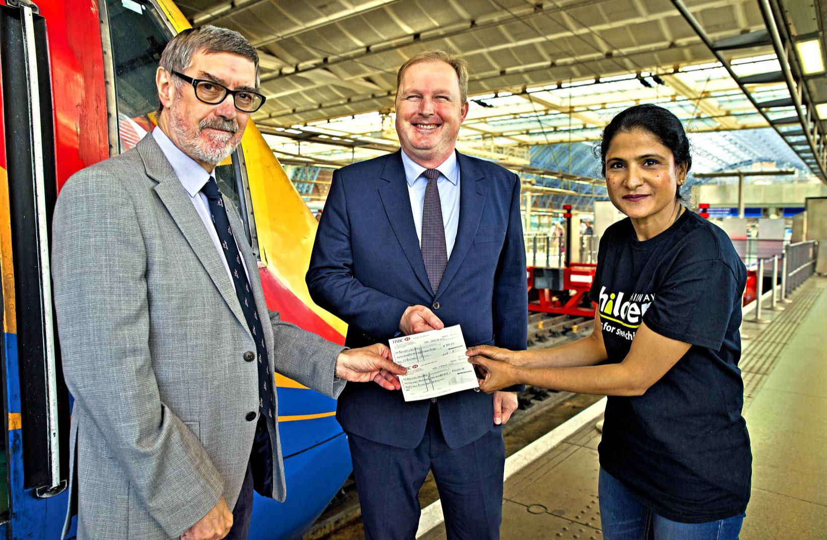 St Pancras International on 1 Aug and our very smart Treasurer (he is smart with the money and a camera too) with Jake Kelly, MD of East Midlands Trains in the middle, present Society cheques totalling £30,000 to Anuradha Chandran (right) Head of Corporate Partnerships at Railway Children raised during by the Pickering Paxman.