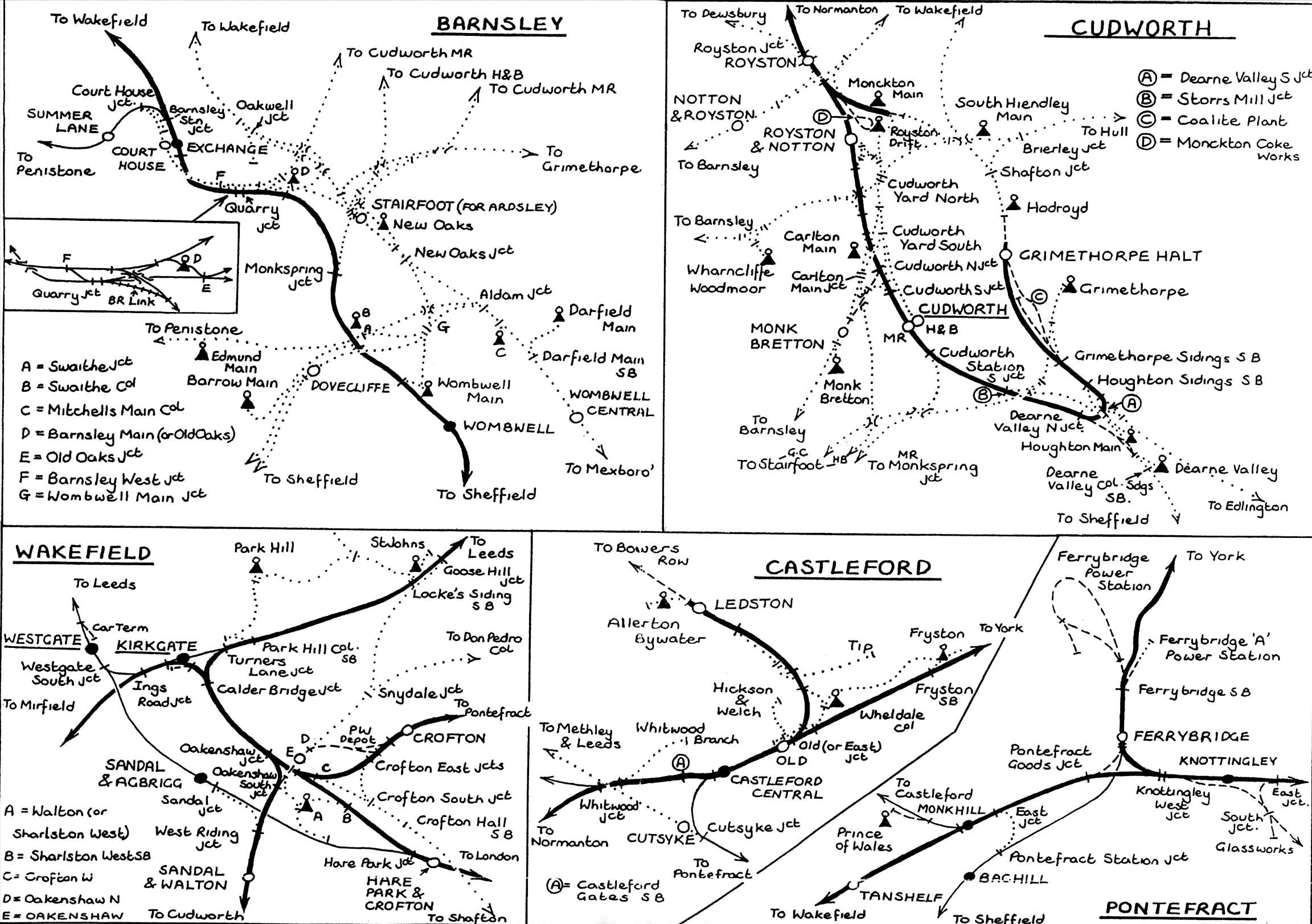 Next was Grimethorpe Colliery and Coking Plant, reached via Dearne Valley North Jn, and a remarkable 180 degree curve, opened by British Rail in 1966. There also used to be a sharp curve in the opposite direction, southeast to Goldthorpe Colliery - part of the 1978 closure mentioned above when Goldthorpe was connected to the S&K at Hickleton Main. The 1966 connections were put in to allow closure of most of the rest of the Dearne Valley line. At Grimethorpe the tour ran past the various installations and reached a point just short of the junction with the coke inlet line, where there was an overbridge carrying a minor road, the location of Grimethorpe Halt (CP 1951), three miles from Dearne Valley North Jn. Grimethorpe was one of the deepest and largest pits in the area and, following mergers with various other collieries, had produced 3.3M tonnes of coal in 1980/1. At the time of the pit closure in 1993 the coal-based businesses in Grimethorpe, including the coking plant, coal preparation plant, research facilities and the NCB area headquarters, employed around 6,000 people, but all of this had closed by 1995. Unsurprisingly Grimethorpe was, at the time, declared the most deprived village in Britain. The colliery was, and still is, famous for its brass band.
