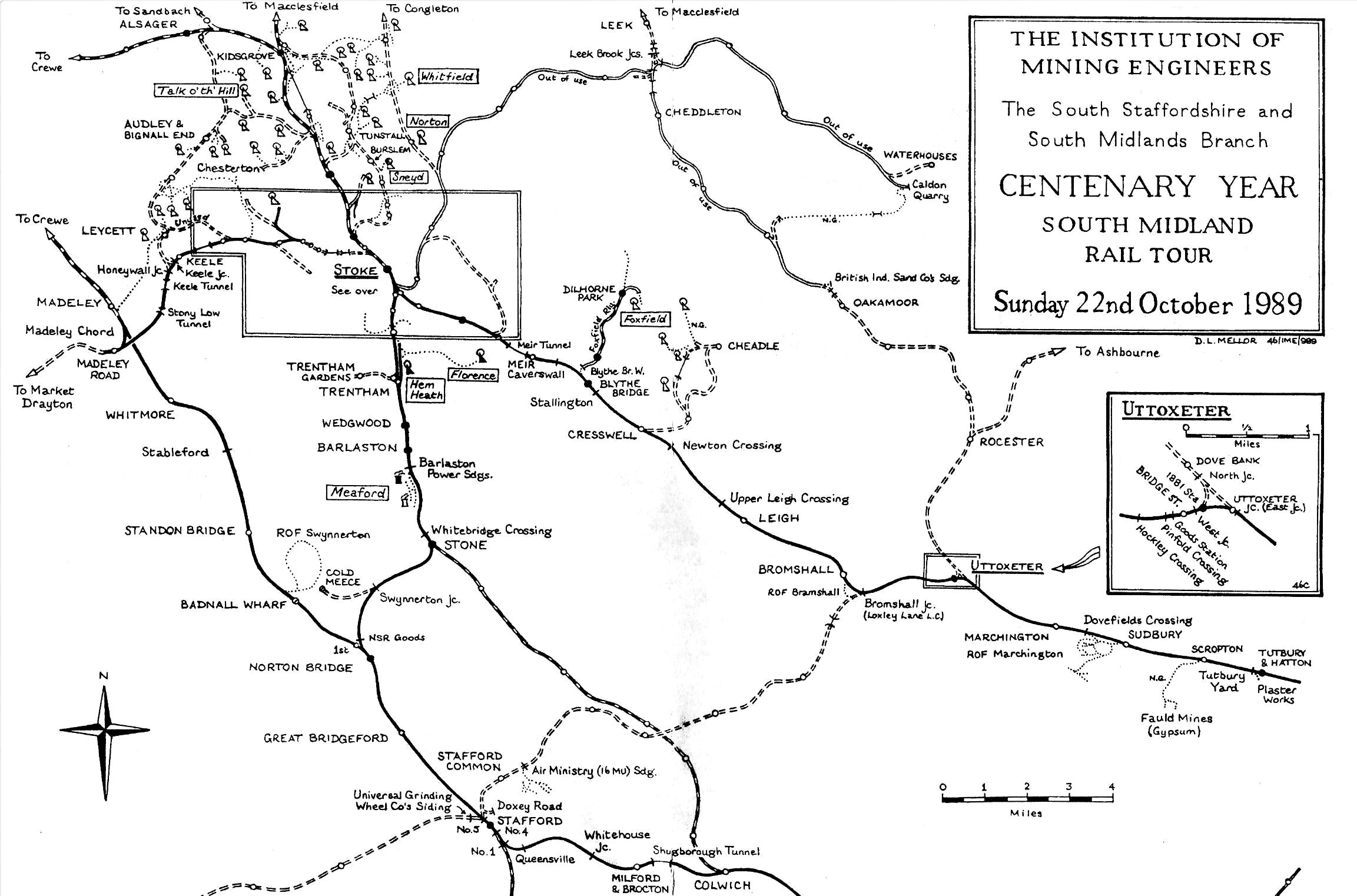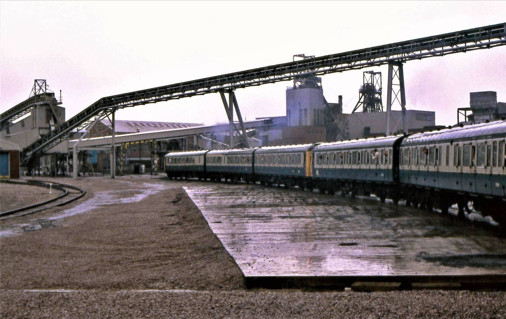 Reversing twice to regain the West Coast Main Line, our DMU continued on north through Stafford to Madeley Jn. A further three reversals followed, the first here at Madeley Jn and then at Madeley Road - the headshunt to the west, once part of a North Staffordshire Railway through line between Market Drayton and Stoke-on-Trent. The tour then passed Silverdale Colliery (3m 45ch from Cockshute Jn at Stoke) to the left with an MGR bunker on the adjacent line; it was the final deep mine in the North Staffordshire Coalfield, surviving until Sep 1998. The third reversal took place at Apedale Jn (2m 01ch), where we took the Apedale Branch past the former Knutton Gate Jn and to Holditch Colliery 1½ miles from Apedale Jn. Past Knutton Gate Jn to Apedale had closed in 1967; the Apedale Light Railway runs on part of the branch. For many, Holditch was the highlight of the day, as the colliery (the biggest in the area once with 1,309 men) closed three months earlier in Jul 1989 and the last coal train had run.