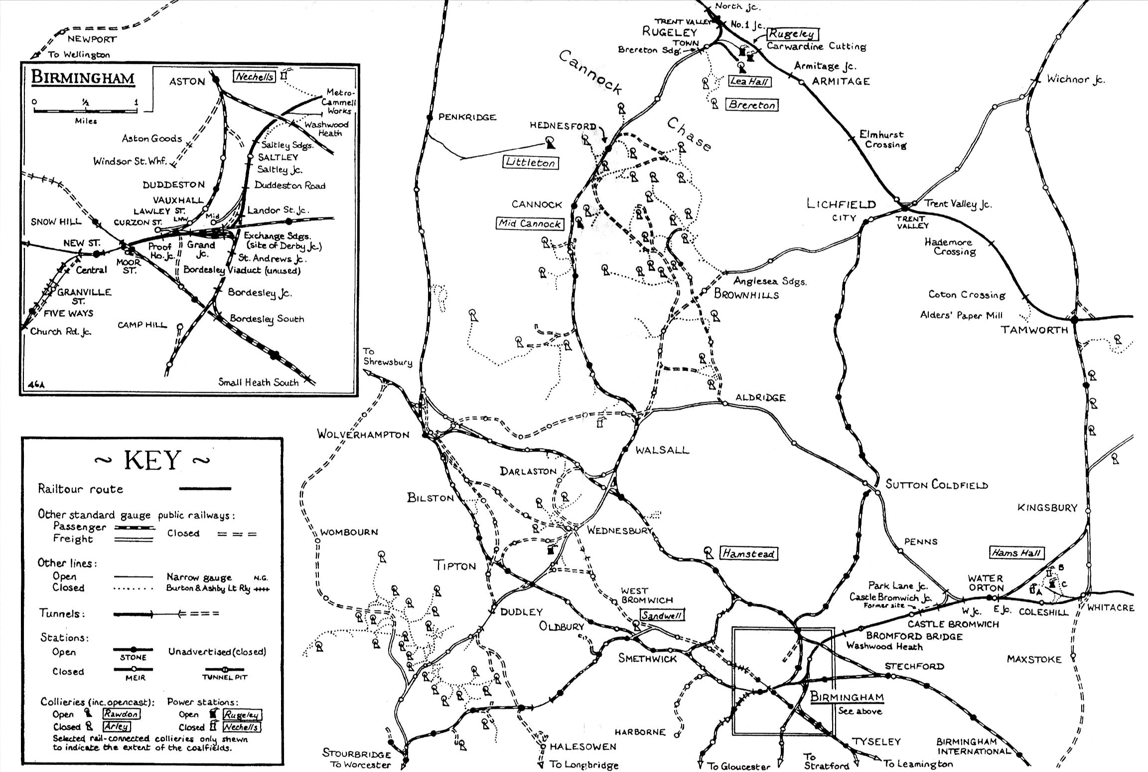 Three reversals, at Nuneaton, Rugeley North Jn & Brereton Sidings (at Rugeley Town; ROP 2 Jun 1997) brought us over a since removed trailing crossover (13m 34ch), done later again on our return, to our next destination, Lea Hall Colliery. This was the first one opened by the National Coal Board, in 1954, and it closed in 1990. The itinerary had indicated that we would stop at the British Rail limit of working, short of the conveyor belt taking coal directly to the adjacent Rugeley 'A' Power Station - still operational then (the 'B' Power Station could not burn coal from Lea Hall as the quality was too good, (!) as well as its high chlorine content). On the day the tour actually ran through the reception sidings and finally stopped at a set of points just short of the last headshunt, a further 700 yards on!