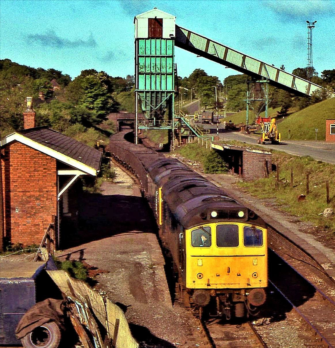 May 1982, Silverdale rapid loading bunker, the colliery was off to the right. It closed in 1993, but was reopened the following year under private ownership and lasted until 1998. Looking west to Madeley Jn/Market Drayton. A pair of Class 25s (the usual motive power) brings wagons from Crewe Sorting Sidings South for Holditch Colliery; most of its output went to Shotton Steel Works. This section of the line from Stoke-on-Trent was once double track; Silverdale station here CP 2 Mar 1964.