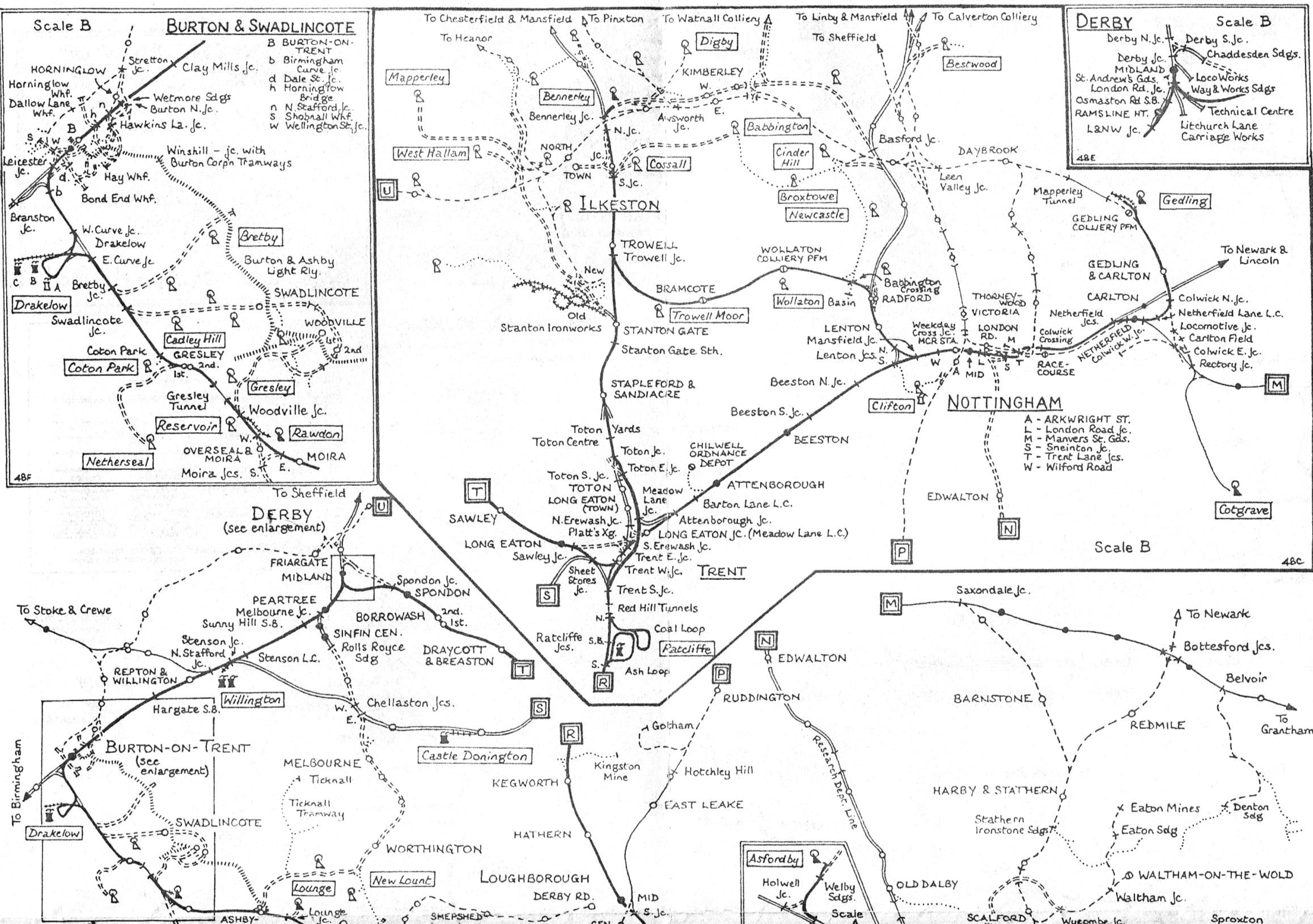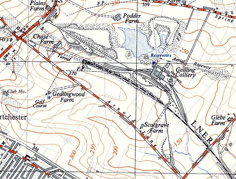 Gedling Colliery in 1950; top left is Mapperley Landsale Depot (coal) & Mapperley Tunnel - the latter's poor condition caused closure of the line beyond Gedling Colliery Jn (by the 'L' in LNER) from 4 Apr 1960. Bottom right is to Colwick North, West & East Jns, Rectory Jn and Colwick Yards.