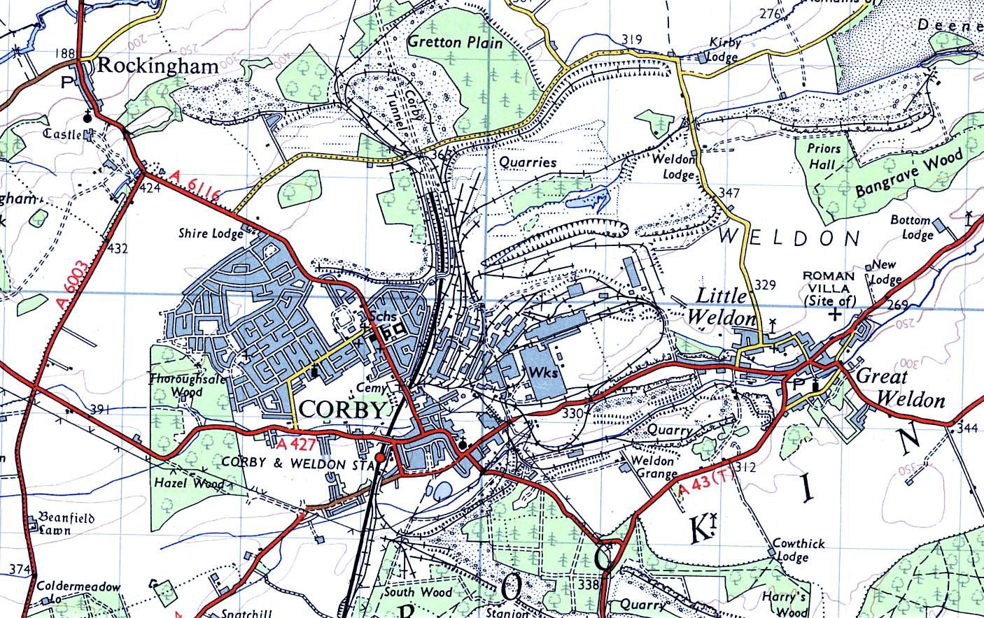 Corby in 1961 with the Works and some of the ironstone branches. (The Wakerley branch is top right corner and had been extended by 1980.)