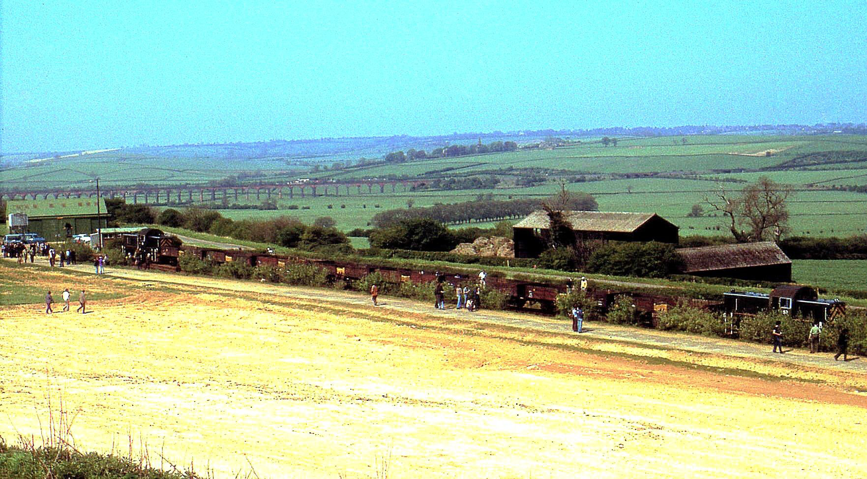 Industrial Railway Society 17 May 1980 farewell trip (advertised in BLN) over part of the once extensive Corby iron ore quarry network. The trip was nearly 6 miles from Gretton Brook shed to Wakerley - the longest branch - seen here with Harringworth Viaduct in the distance. Two ex-Western Region Class 14 locos ran 'top & tail' with 8 open tube wagons on what was, fortunately, a sunny day.