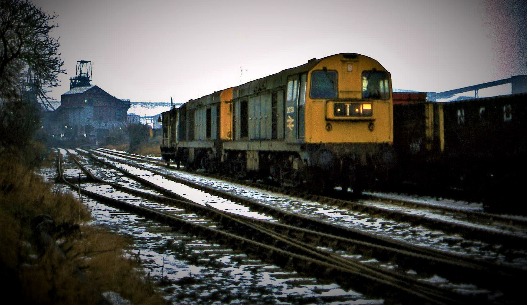 Jan 1980, a pair of Class 20s at Gedling Colliery old sidings with NCB wagons to the right.