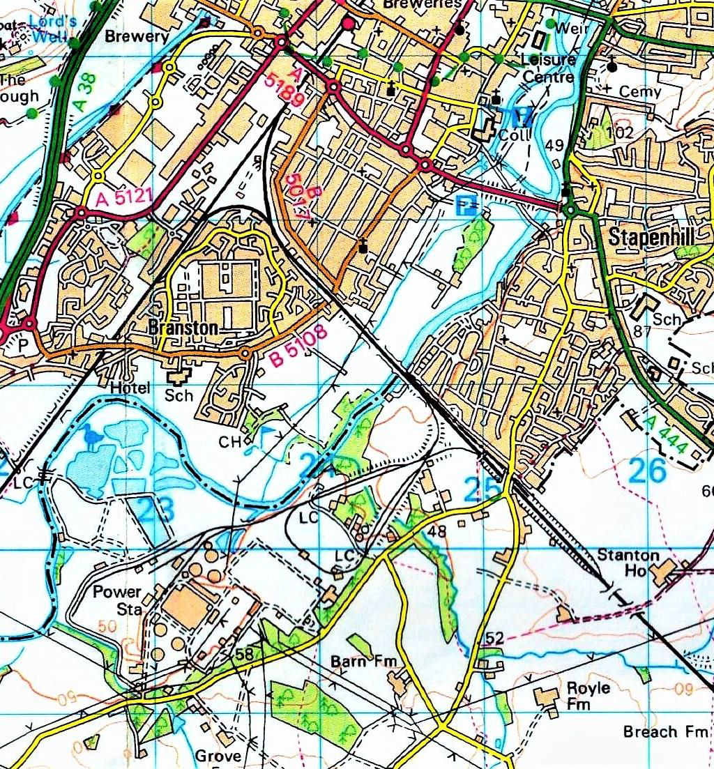 Drakelow Power Station after demolition of 'A' & 'B' stations showing their loop and the branch to the then remaining 'C' station. Burton-upon-Trent is at the top, Coalville is off bottom right.