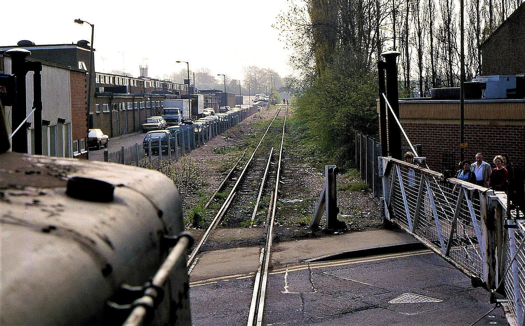 Then last train from Snibston. From the cab of the National Coal Board (NCB) loco hauling the final wagons to leave on 15 May 1985, crossing Belvoir Road crossing, (the main street in Coalville), heading to the junction - the colliery is behind. This trackbed is now a foot and cyclepath.