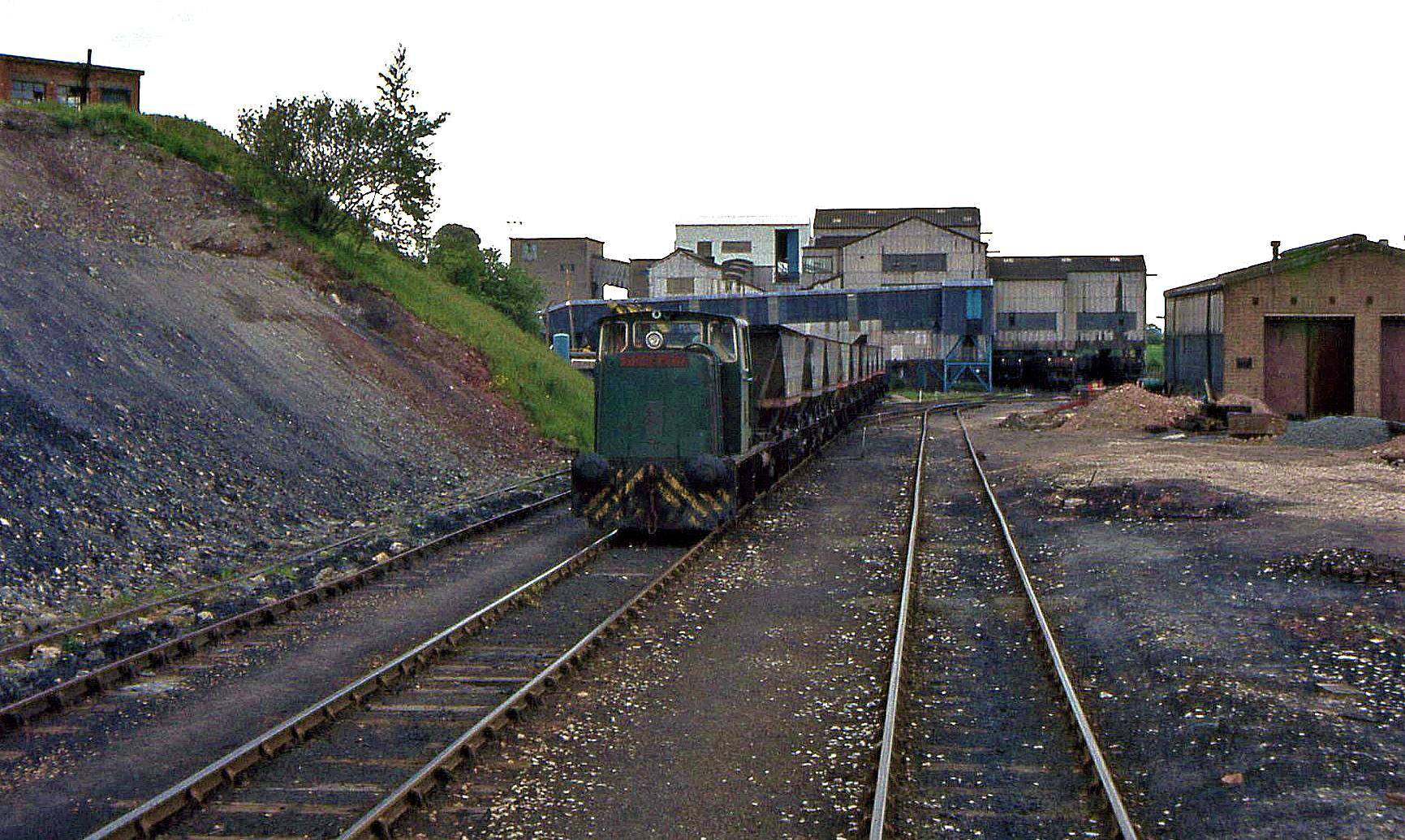 An earlier visit to Cadley Hill Colliery (the destination of the 15 May 1985 train) in Jun 1983; an NCB shunter is hauling a set of wagons through the loading bunker. Steam worked here regularly until about 1980 as the colliery manger was a steam enthusiast and collected industrial steam locos!