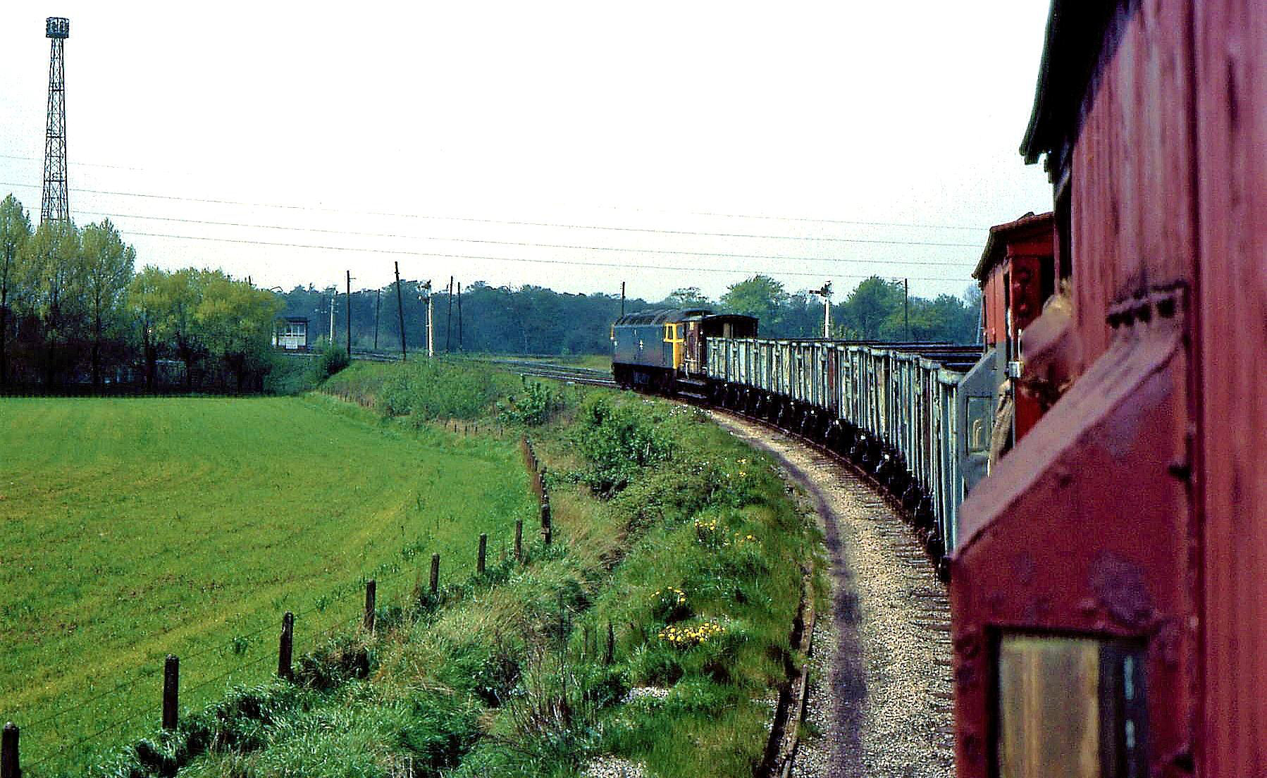 Later on 15 May 1985, from the rear brake van of the train of final wagons from Snibston Colliery, on the curve into Drakelow A & B loaded sidings, where the train reversed before proceeding to Cadley Hill Colliery.