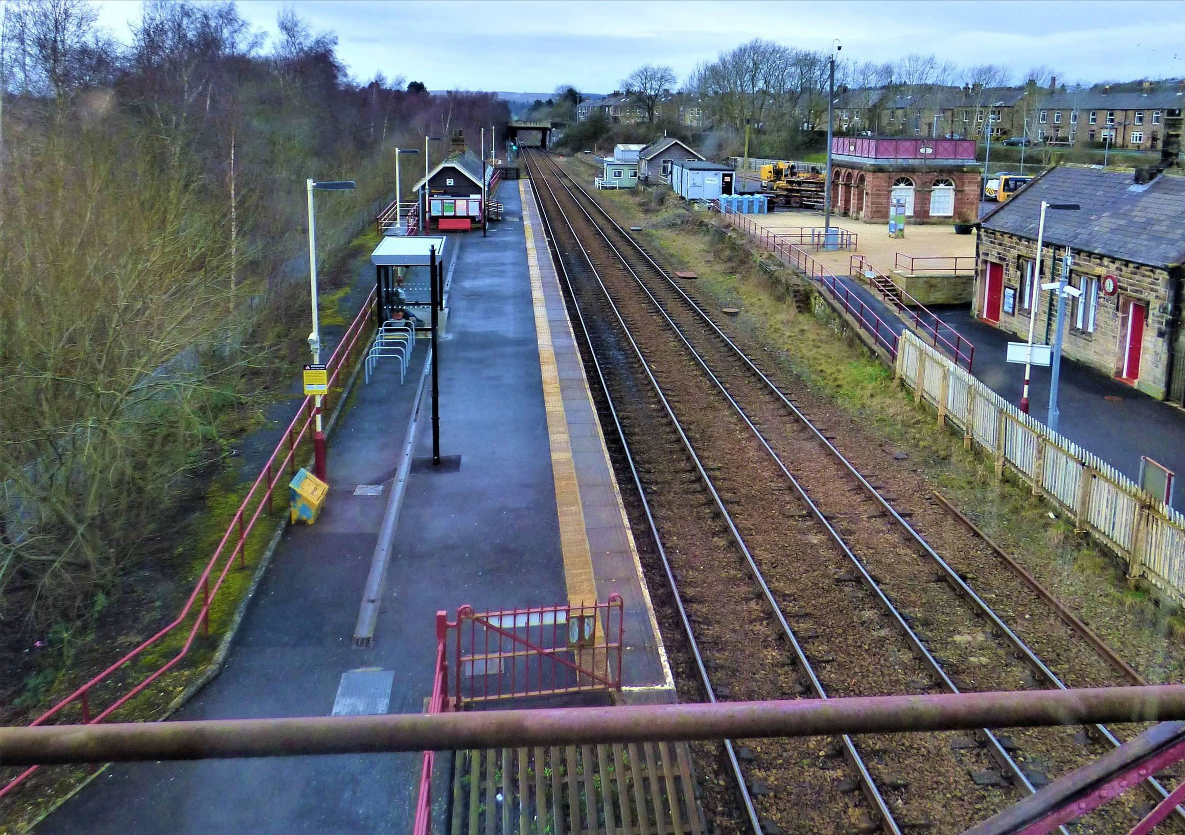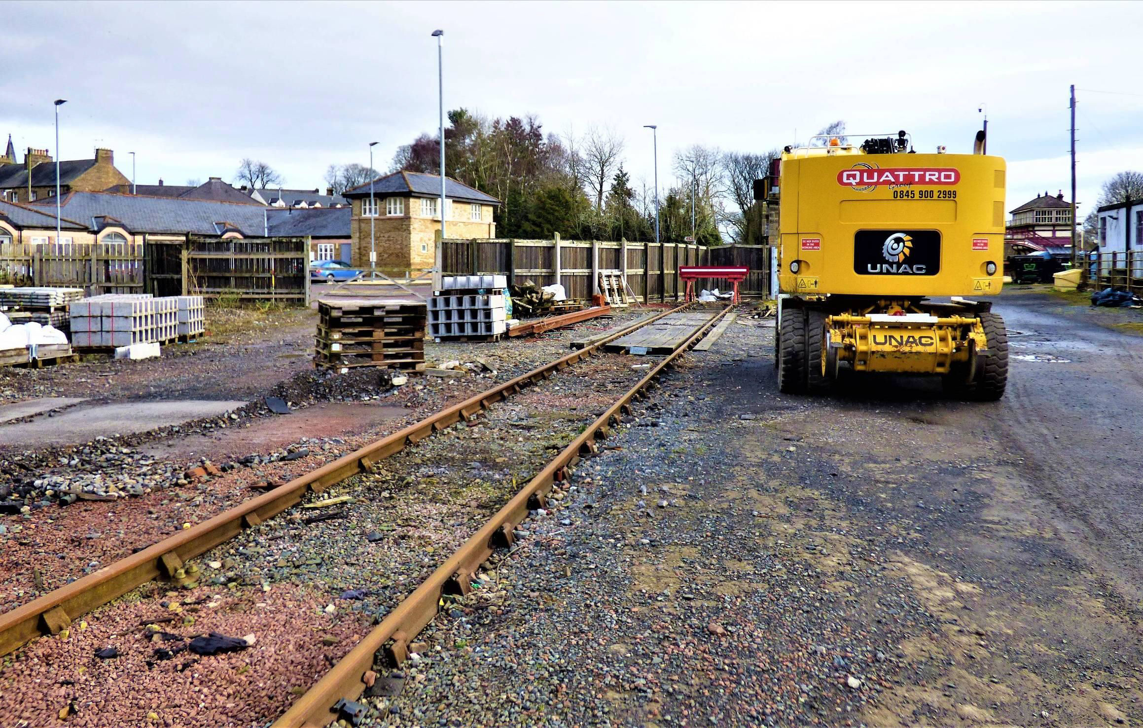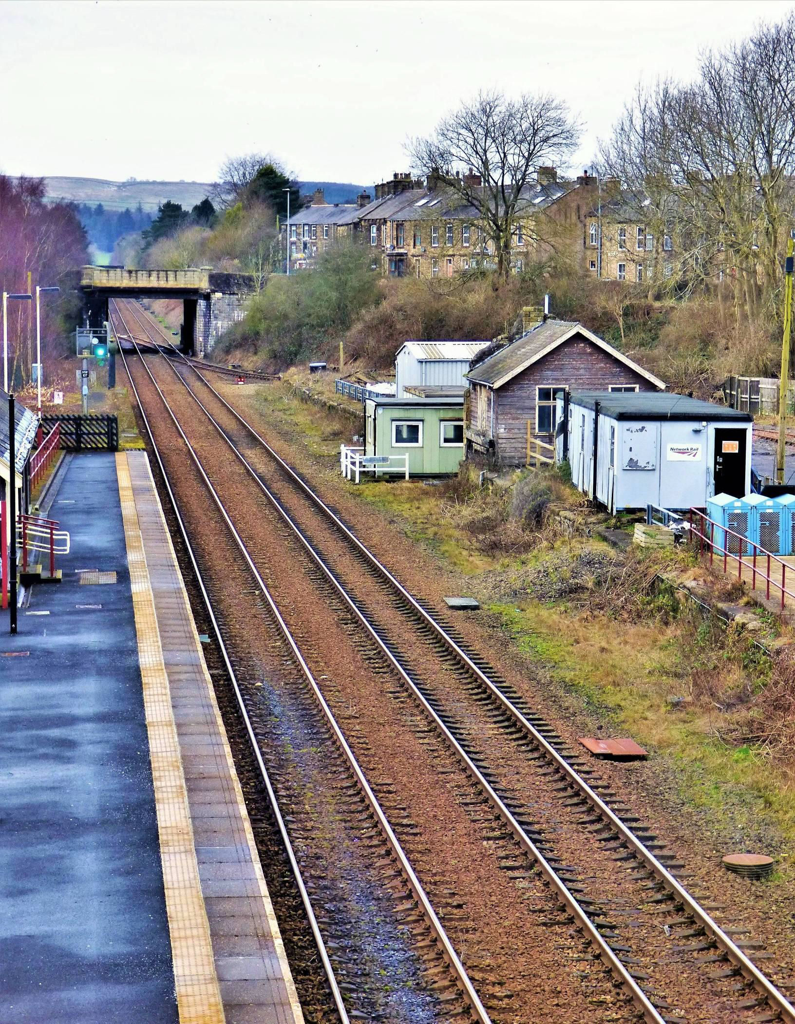 There is a trailing crossover west of the station, allowing access to a still-active P'Way siding in the old goods yard, behind the box. A former second siding, still on Google Maps and Oct 2016 TRACKmaps, had presumably been removed quite recently (and certainly by 5 Feb 2019). This crossover also allows trains which terminate at Haltwhistle (from either direction) to shunt ECS to the other platform to turnback, with a Limit of Shunt (effectively a permanently red signal) provided on the Down Line for such moves. A separate portable building houses the Relay Interlocking for the panel.