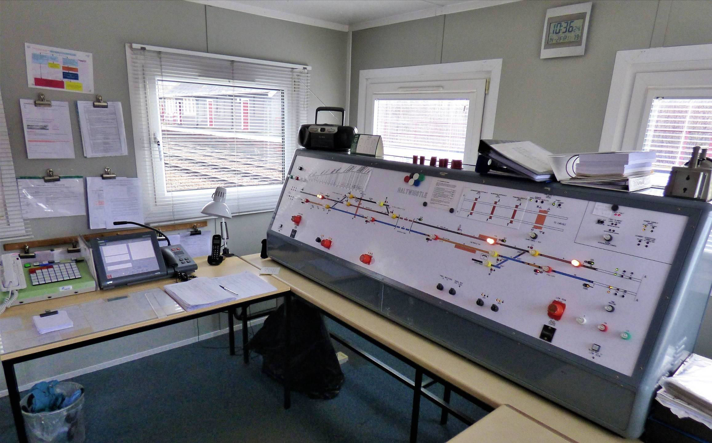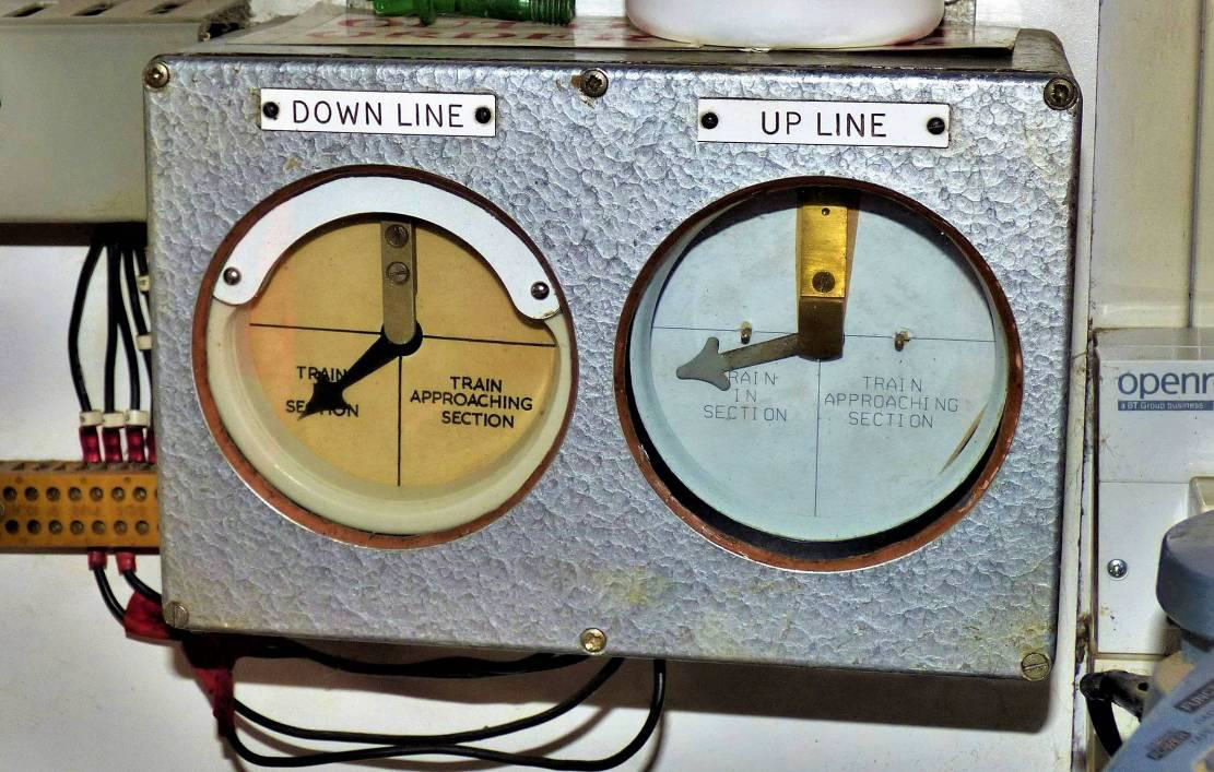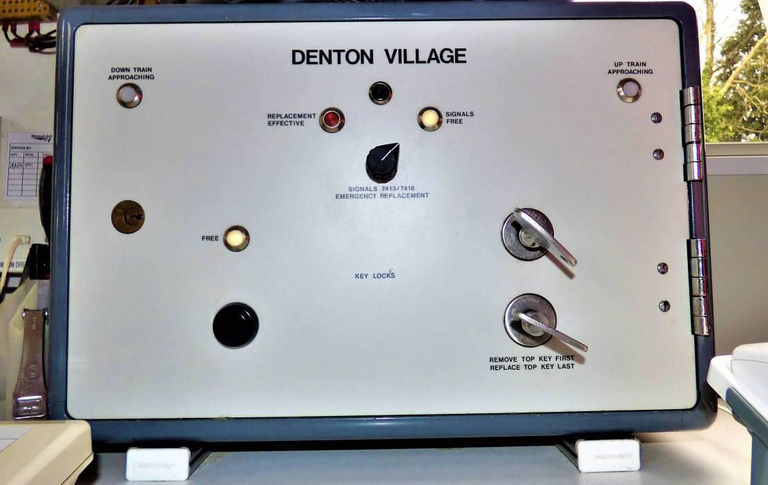 Traditional standard Absolute Block 'Train in Section/Train Approaching Section' indicators are fixed to an inside wall of the cabin. A TRUST (Train Running System on TOPS - British Rail's Total Operations Processing System) screen is on the crossing keeper's desk and a modern key lock instrument is provided with 'Train Approaching' lights. It is suspected, but unconfirmed, that the last are lit when the Absolute Block indicators show either 'Train Approaching Section' or 'Train in Section'; it is possible also that they are operated independently by treadles or track circuits. The key lock instrument also has an emergency replacement switch which turns signals LR7413 and LR7416 to red if it is operated.