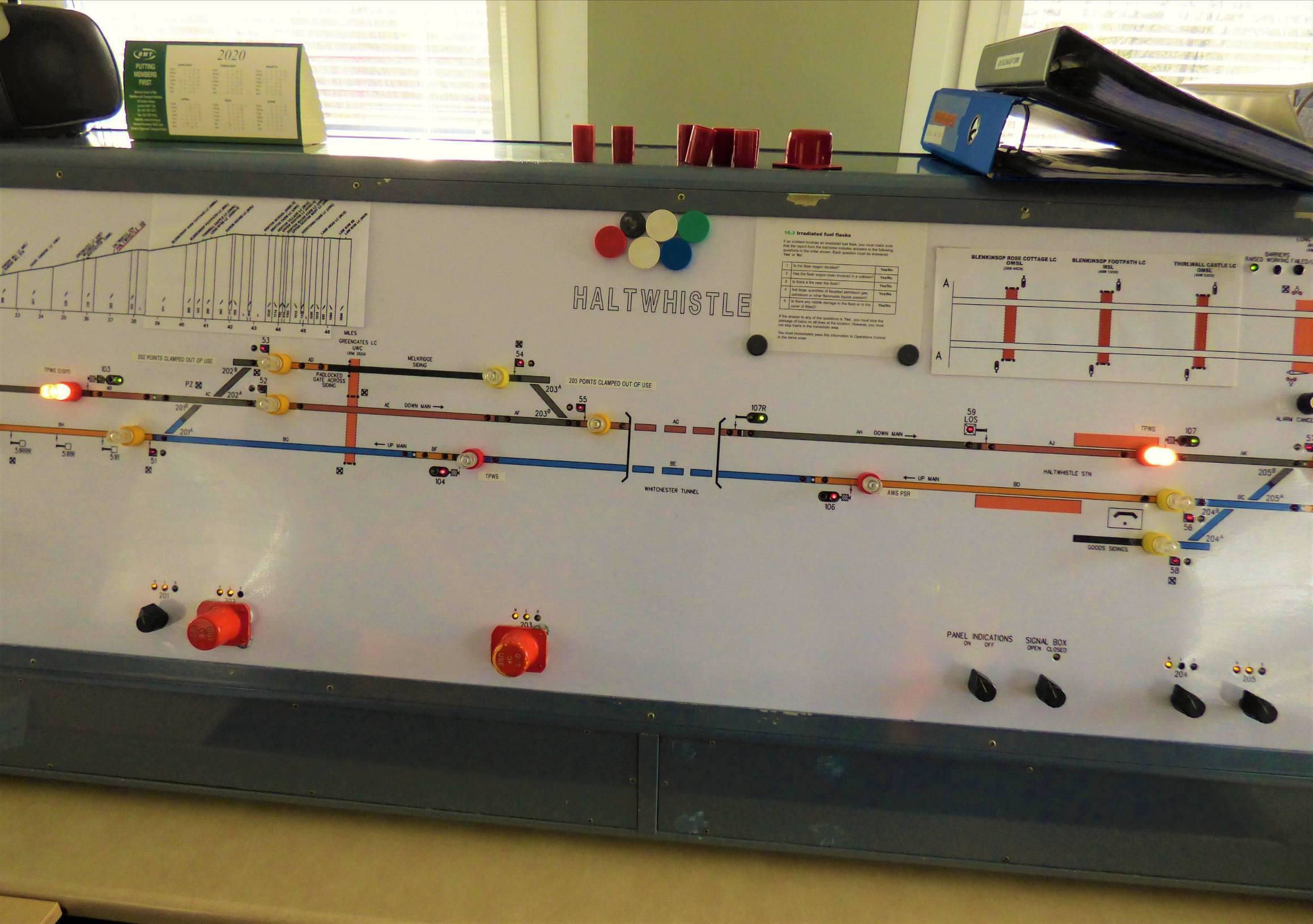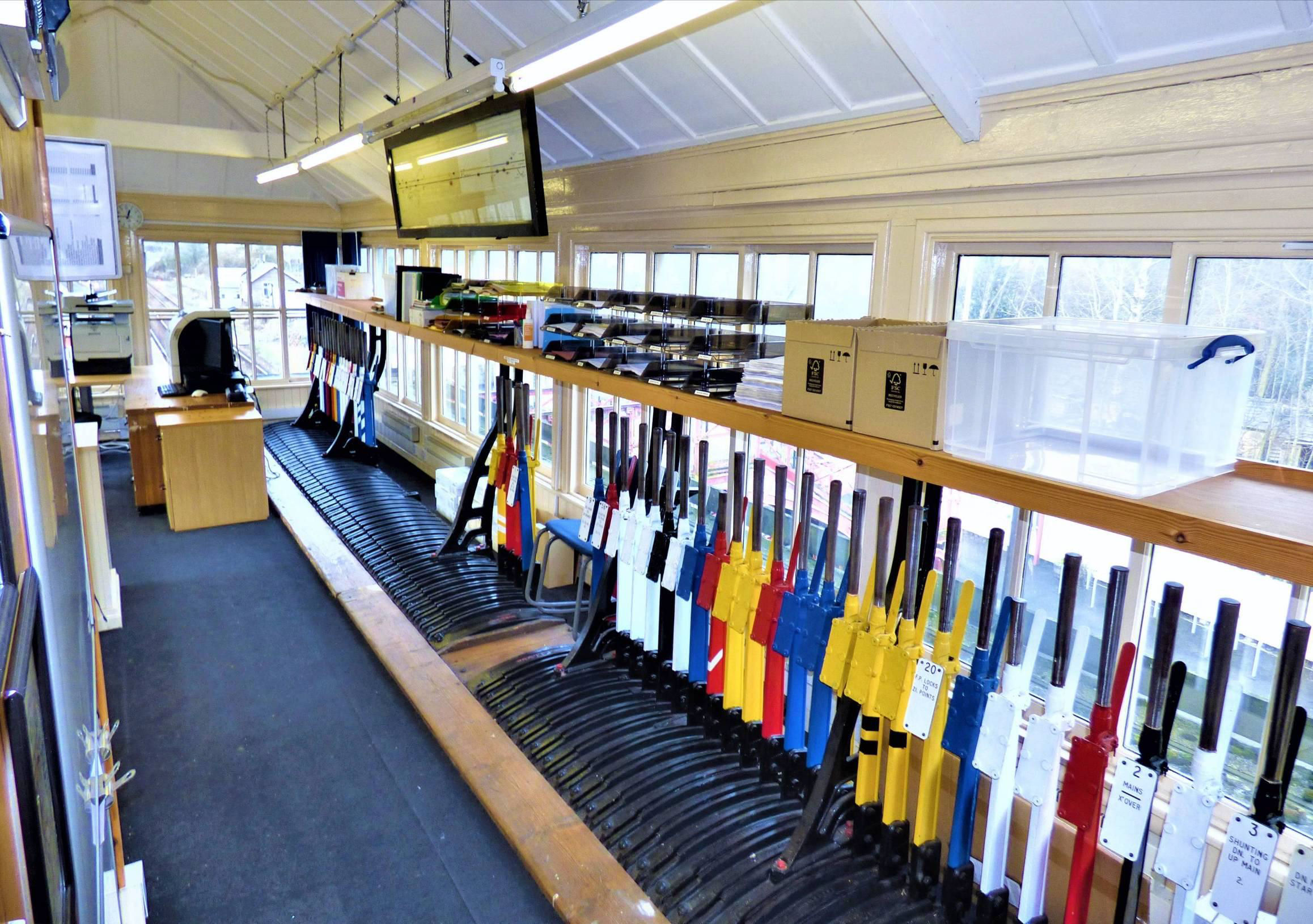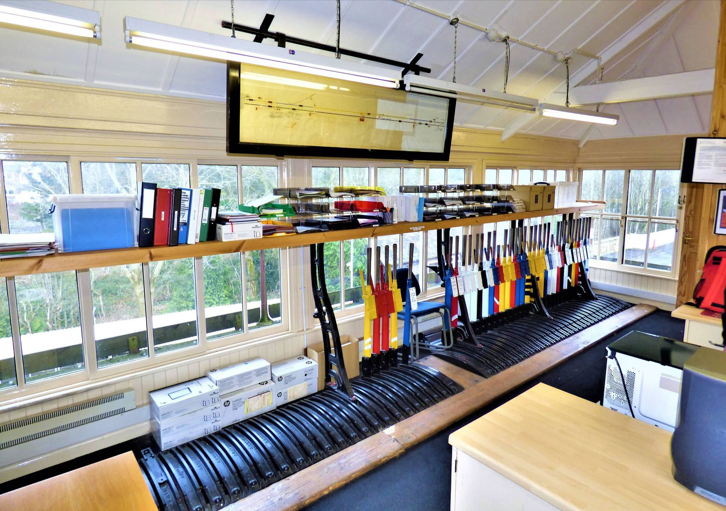 Traditional standard Absolute Block 'Train in Section/Train Approaching Section' indicators are fixed to an inside wall of the cabin. A TRUST (Train Running System on TOPS - British Rail's Total Operations Processing System) screen is on the crossing keeper's desk and a modern key lock instrument is provided with 'Train Approaching' lights. It is suspected, but unconfirmed, that the last are lit when the Absolute Block indicators show either 'Train Approaching Section' or 'Train in Section'; it is possible also that they are operated independently by treadles or track circuits. The key lock instrument also has an emergency replacement switch which turns signals LR7413 and LR7416 to red if it is operated.