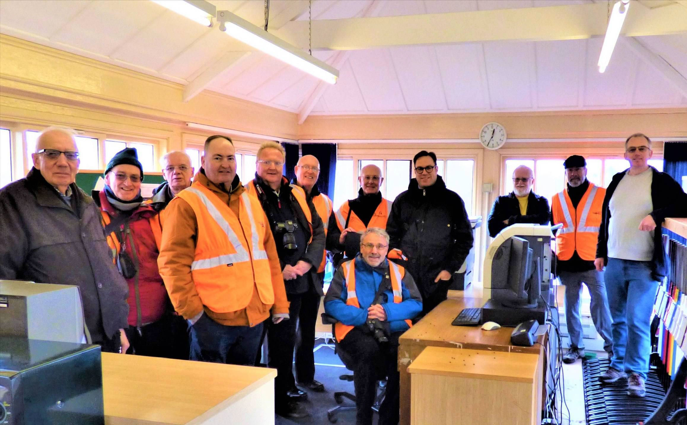 A 'token' selection of our members 'staff' our Society's 14 Feb 2020 signal box visits in Haltwhistle NER box. Organiser and party leader, Nick Jones, is 'in the frame', far right. It was less than six weeks later that social distancing was invented.