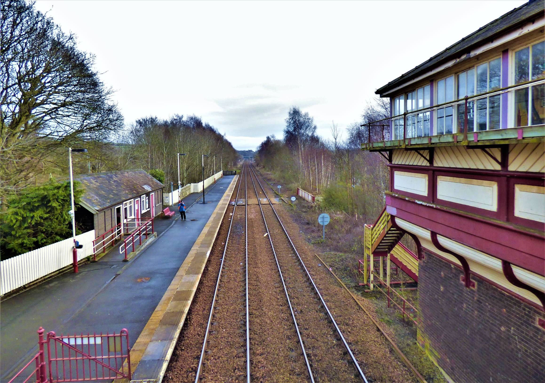 Haltwhistle: The station house, footbridge, the grand circa 1901 former North Eastern Railway (NER) restored signal box and water crane are all Grade II listed at this delightful station, as is the nearby viaduct over the River South Tyne (the 'Alston Arches' on the Alston branch). Building the Newcastle & Carlisle Railway and the station here required a diversion of the River and the adjacent turnpike road.