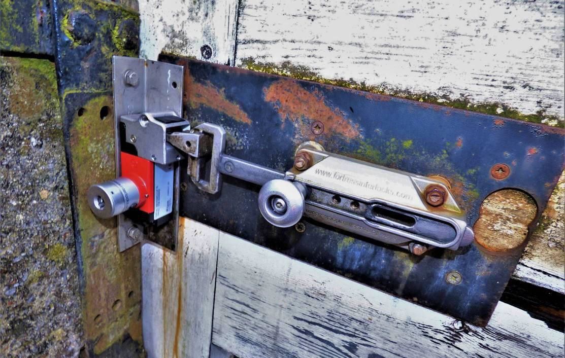 Both gateposts have modern key-locks of the 'Fortress Interlocking' (trapped key type), which were also found on the Wherry Lines in Norfolk. These are operated using the keys held by the instrument in the keeper's cabin. Unlike the Wherry Lines, the keys for each lock here are identical so either key can be used for either gate. The crossing is protected by Low Row signal '7413' in the Down (to Carlisle) direction and '7416' in the Up direction; each is a considerable distance from the crossing.