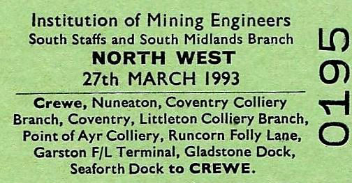 See https://bit.ly/3nf1Mgw There was another year's break between the 10th (or even the 11th, depending upon how the two part 1989 tour is treated) and this final tour. The title was a little misleading as none of the three collieries visited were in the North West, two were in the Midlands and the other in North Wales. This railtour was notable for the fact that two of the colliery branches covered were normally only used by British Coal locomotives, and it was also unusual in that it started at Crewe and finished at Nuneaton.