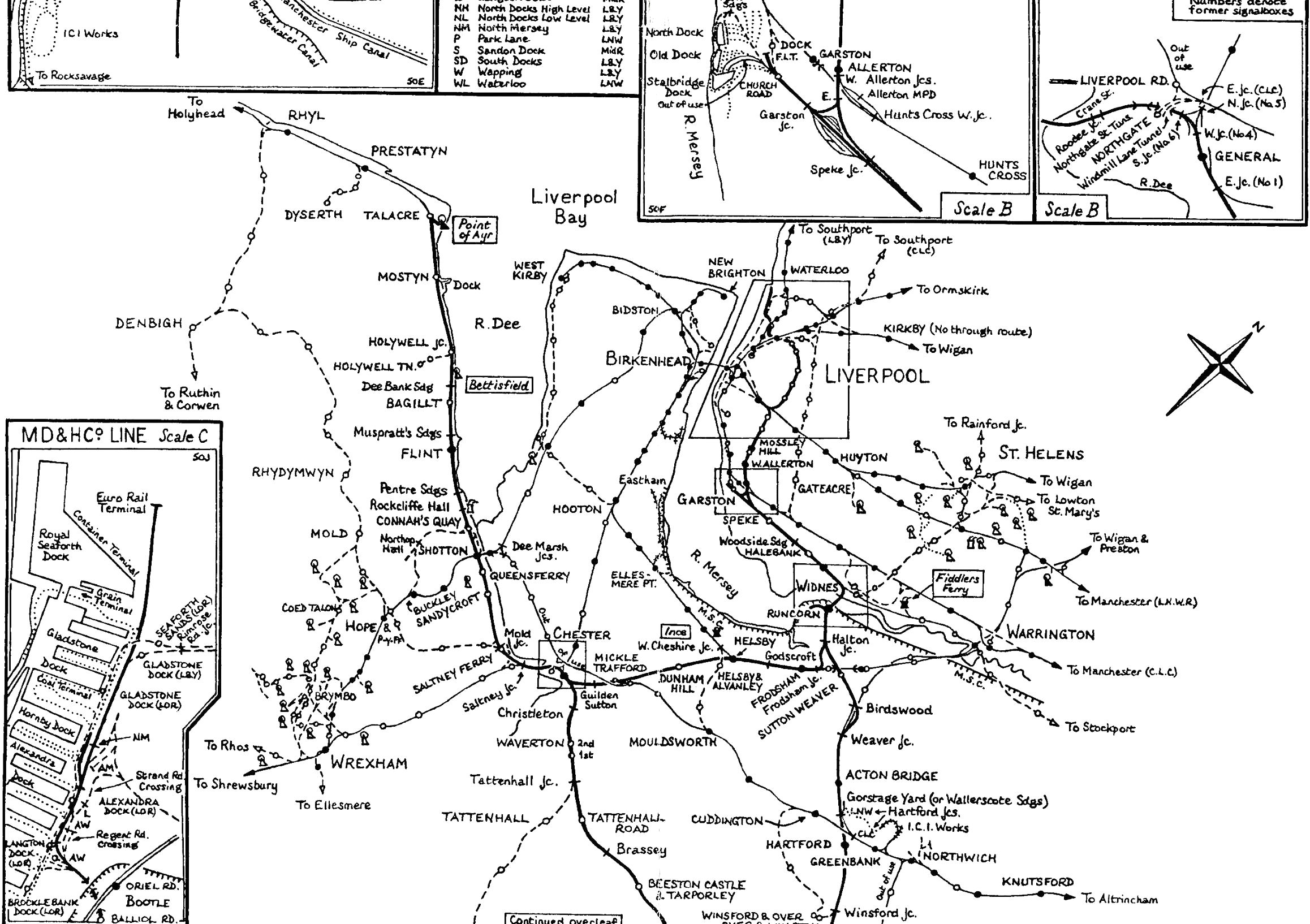 The final picture is from a different era. The Wirral Railway Circle ran a brakevan tour on 11 Aug 1973, covering much of the Mersey Docks & Harbour Company Liverpool Docks system, shortly before its closure later that year. This view shows the train approaching one of the swing bridges.