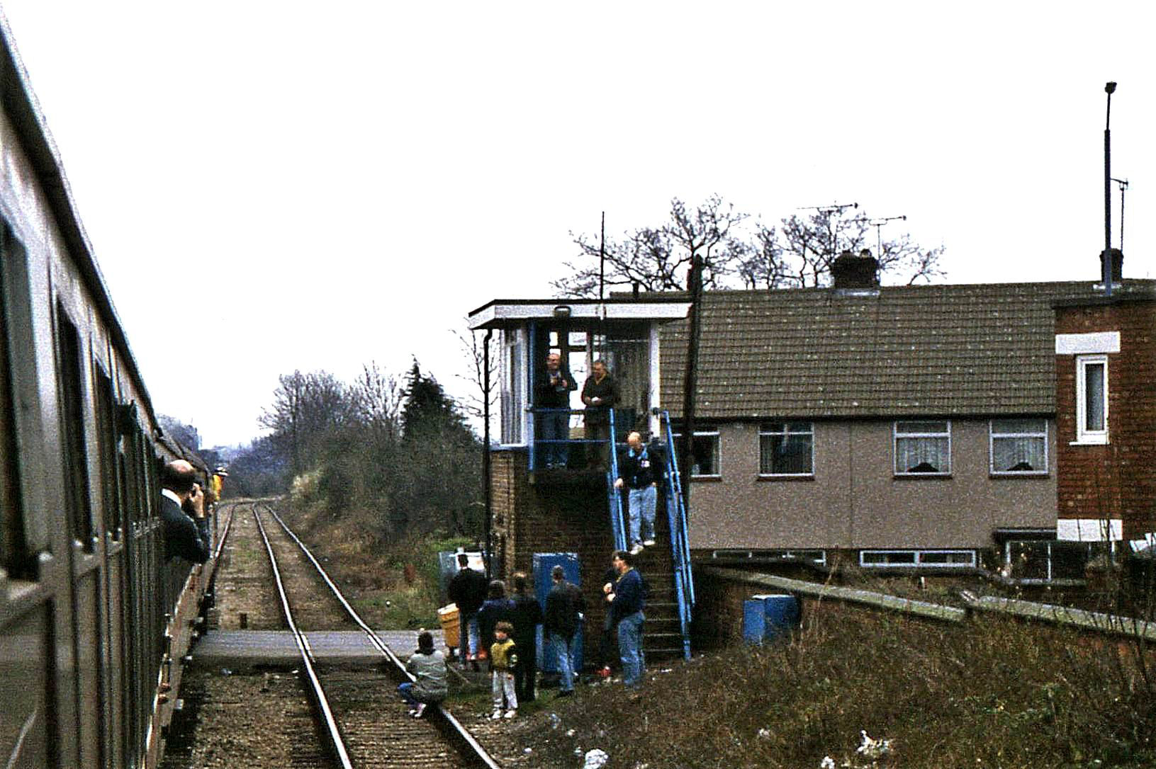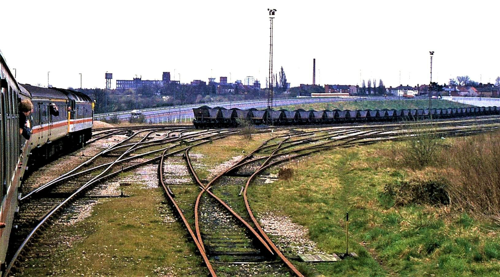 Returning to Three Spires Jn, the tour continued on to Coventry, then through Stechford, Bescot and Bushbury Jn for a reversal at Littleton Colliery Shunt Frame (22m 74ch) just south of Penkridge on the Up side. The two exchange sidings (each accommodating half a merry-go-round set so trains had to be split inward and out) were next to the main line. Interestingly they were both electrified although it is unlikely that an electrically hauled coal train ever ran! As at Coventry Colliery we had permission to proceed nearly 3 miles up the lengthy branch, crossing over the Staffordshire & Worcestershire Canal, under the M6, and passing some sidings that formerly ran to the canal before they were cut back to build the motorway. The tour stopped just short of the B5012 road bridge, about a mile before the colliery, where clearance problems prevented further progress. Littleton Colliery was the final pit in the once extensive Cannock Chase coalfield. It was extensively modernised, designated a core pit at the end of 1992 and produced over 1M tonnes a year, but closed 3 Dec 1993 with the loss of 800 jobs.