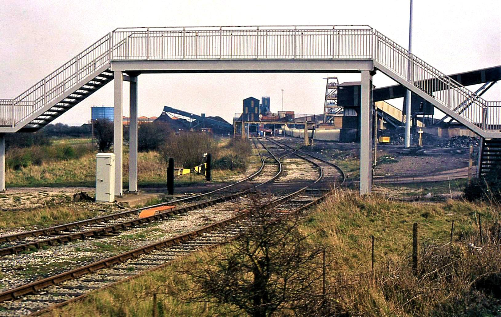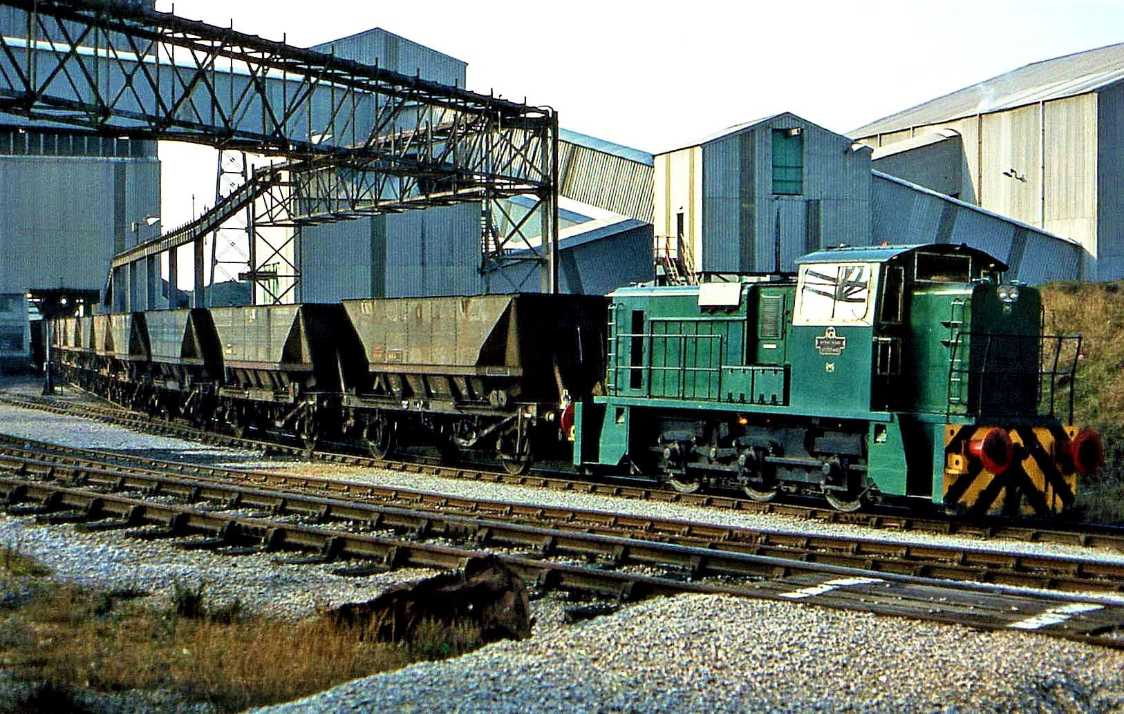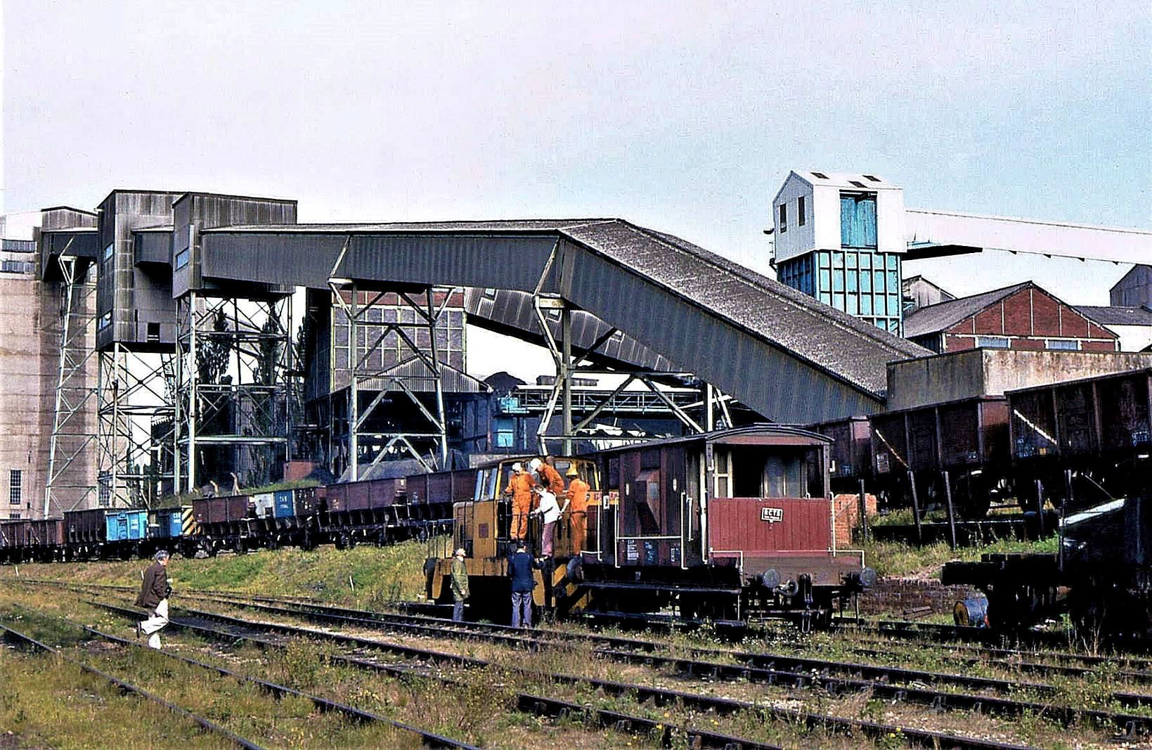 Taken during the same 17 Feb 1981 tour, a colliery loco hauling a set of MGR wagons through the loading bunker at Littleton Colliery. Note how new everything looked then!