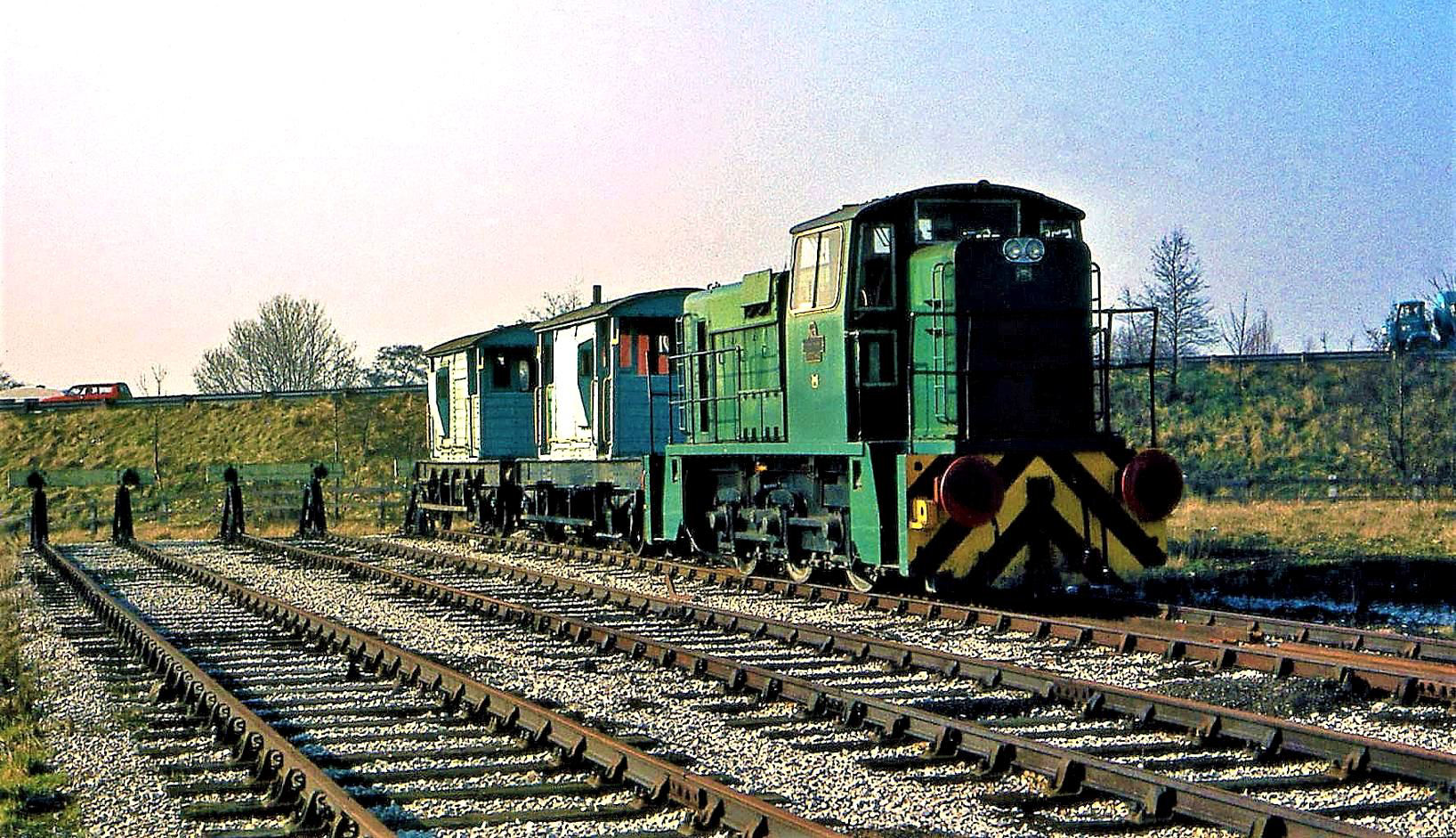 A Society brake tour of Littleton Colliery and its branch on 17 Feb 1981 included a visit to Canal Wharf Sidings which, as the name suggests, were on the stub of what was a branch to the Staffordshire & Worcestershire Canal. In the background is the M6 - the canal is on its other side. This excellent trip was arranged by Ian Mortimer and followed a ride on the 'fireless' steam loco at Four Ashes Croda Chemical Works nearby, alongside the WCML, earlier that day arranged by your Editor.