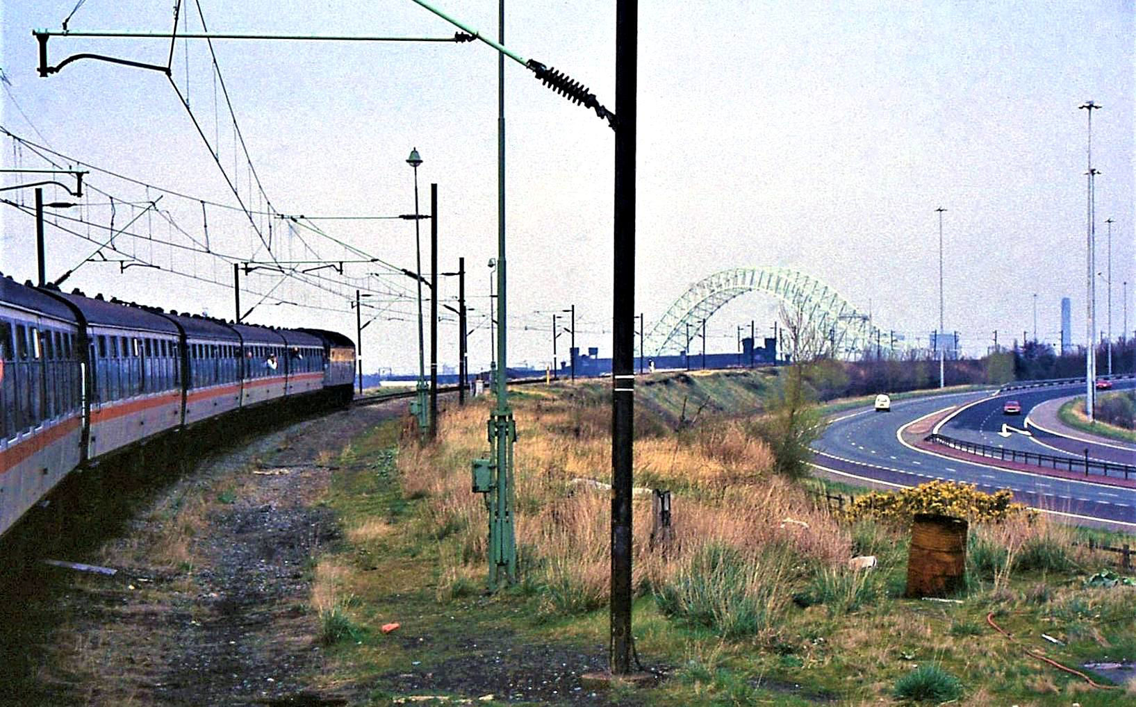 The 1993 tour is returning from Folly Lane to Runcorn Jn with the distinctive road bridge in the background, the rail bridge is in front to the left. Fiddlers Ferry Power Station is far right middle in the distance the other side of the Mersey. The Folly Lane branch was once double track and electrified.