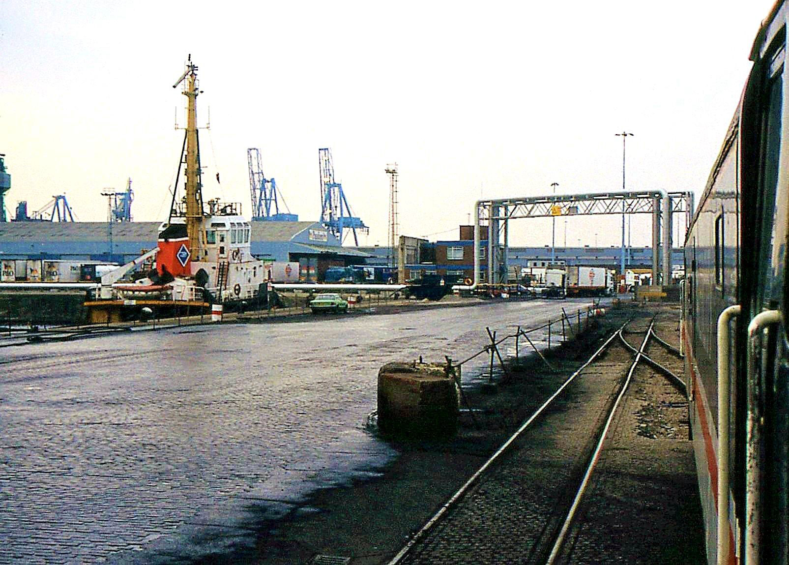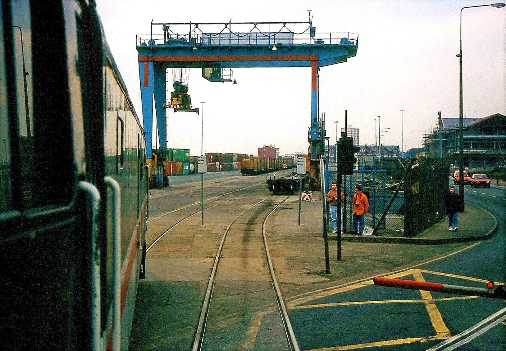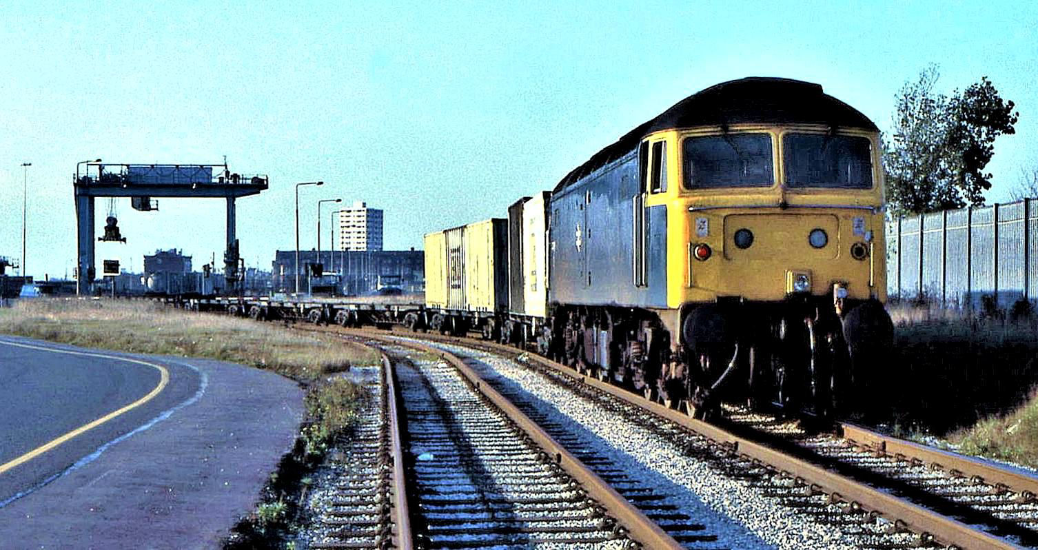 In Oct 1986 a container train is leaving Seaforth terminal; the gantry