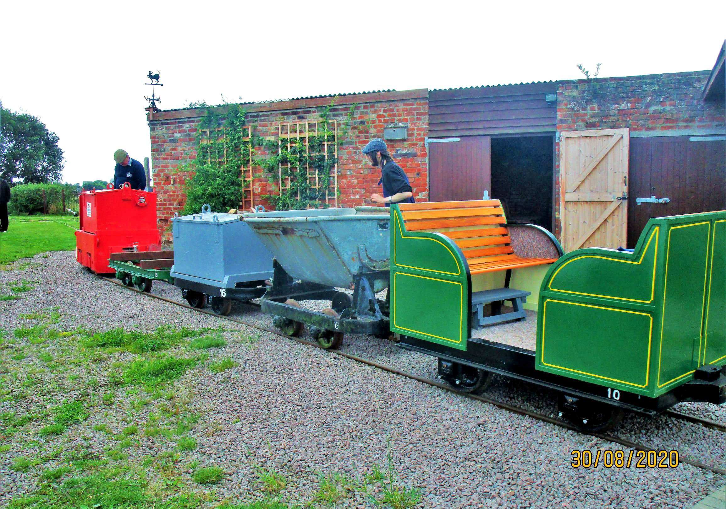 Once all the stock had been returned to its rightful place (easy with 12 keen helpers) it was time to tackle the last remaining track, into the main shed. Another job for the battery engine and executed in true BLS Style with heads bowed (not in deference to royalty or the Fixtures Secretary but due to the rather low beams...). All told it had been a great morning in fine weather and a lovely location. From your correspondent's point of view (and I am sure, everyone else's), it was just great to be back together doing what we all enjoy doing after the longest hiatus in our Society fixtures in recent years.