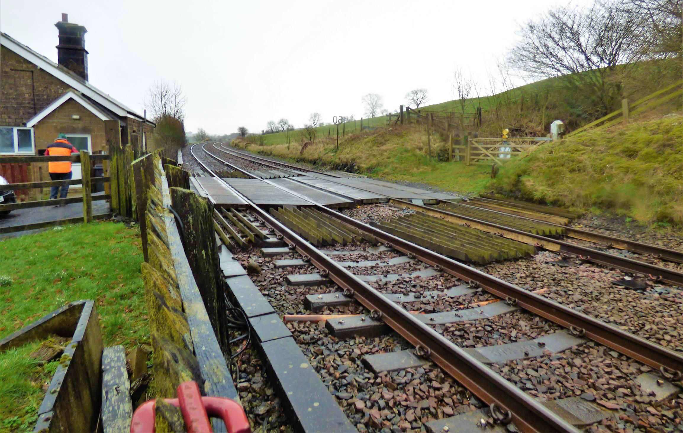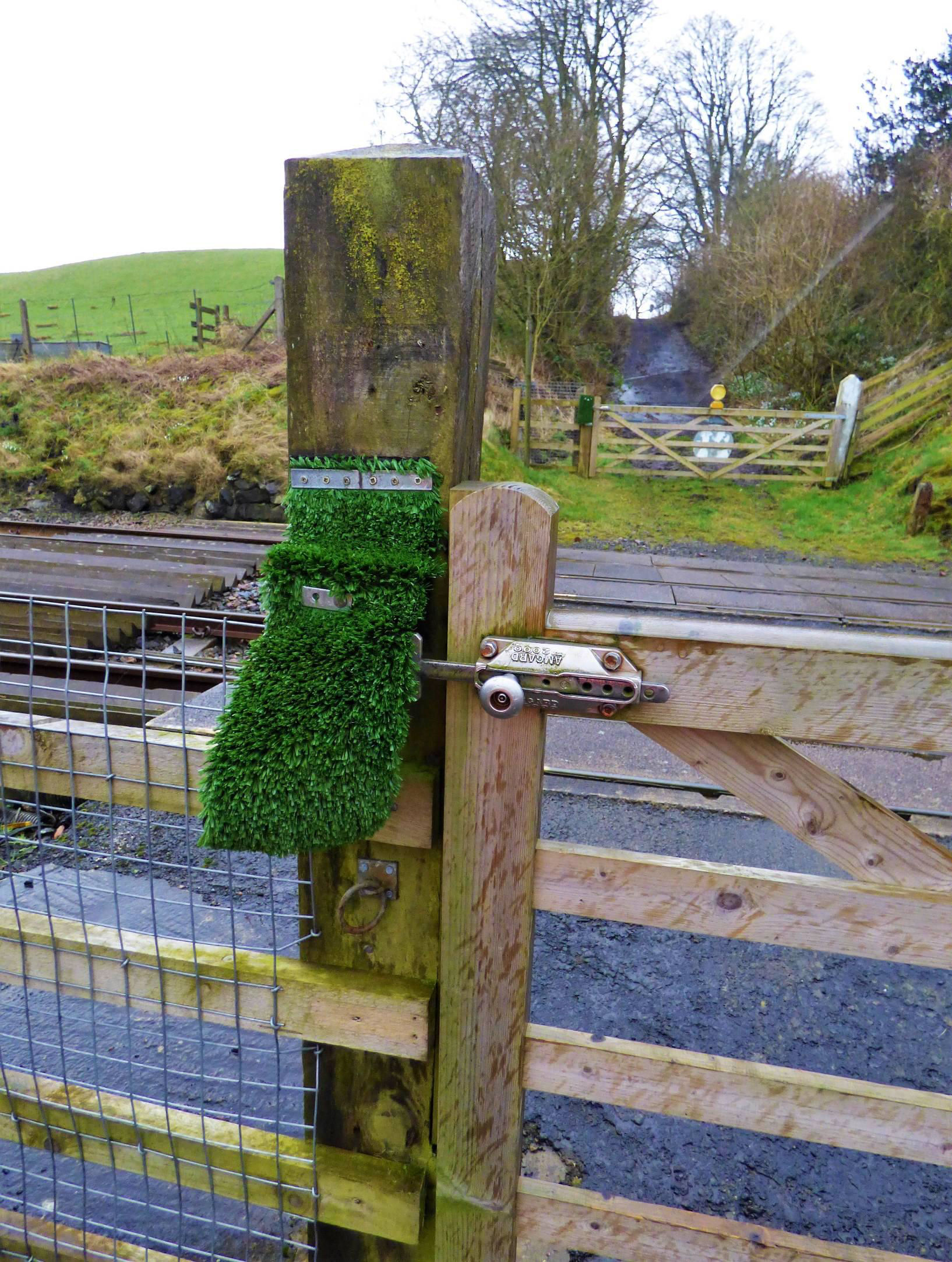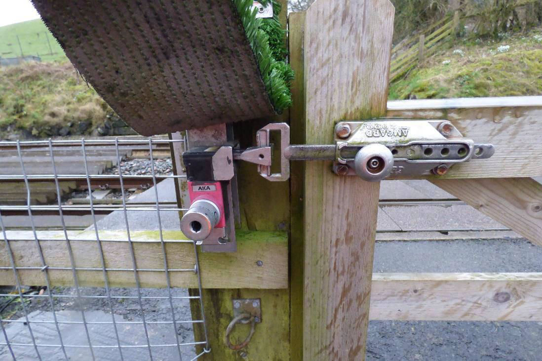 The two gates are both recent replacements of the unpainted field gate type, improbably supplied by AJ Charlton & Sons in Frome in Somerset (maker's plate)! Both have road facing central red targets and Trafilamp style lights on top. The gates are hung from what appear to be three recent unpainted wooden gateposts and what looks to be an older white painted concrete gatepost on the north side. As at Denton Village, interlocking with the signalling is provided by similar AMGARD 2000 Fortress Interlocking key locks and the unusual situation of the southern gate opening inwards towards the railway and the northern gate outwards away from it is replicated here, likely as a result of the steep falling gradient on the road. As at Denton Village, interlocking with the signalling is provided by similar AMGARD 2000 Fortress Interlocking key locks and the unusual situation of the southern gate opening inwards towards the railway and the northern gate outwards away from it is replicated here, likely as a result of the steep falling gradient on the road. Again, the inward opening gate does not foul the line but in contrast to the situation at Denton Village, there are cattle guards on both sides of the roadbed at Lane Head. Perhaps animals are more likely to be driven across the line here than at Denton Village. The current gates seem to be replacements for white-painted ones reportedly present in 2013. Since then, unlike at Denton Village, the former wicket gates here have been secured out of use and are fully fenced over; pedestrians wanting to cross must request the keeper to open the main gates in the same way as any other form of traffic. The exact date when they were taken out of use is not known.