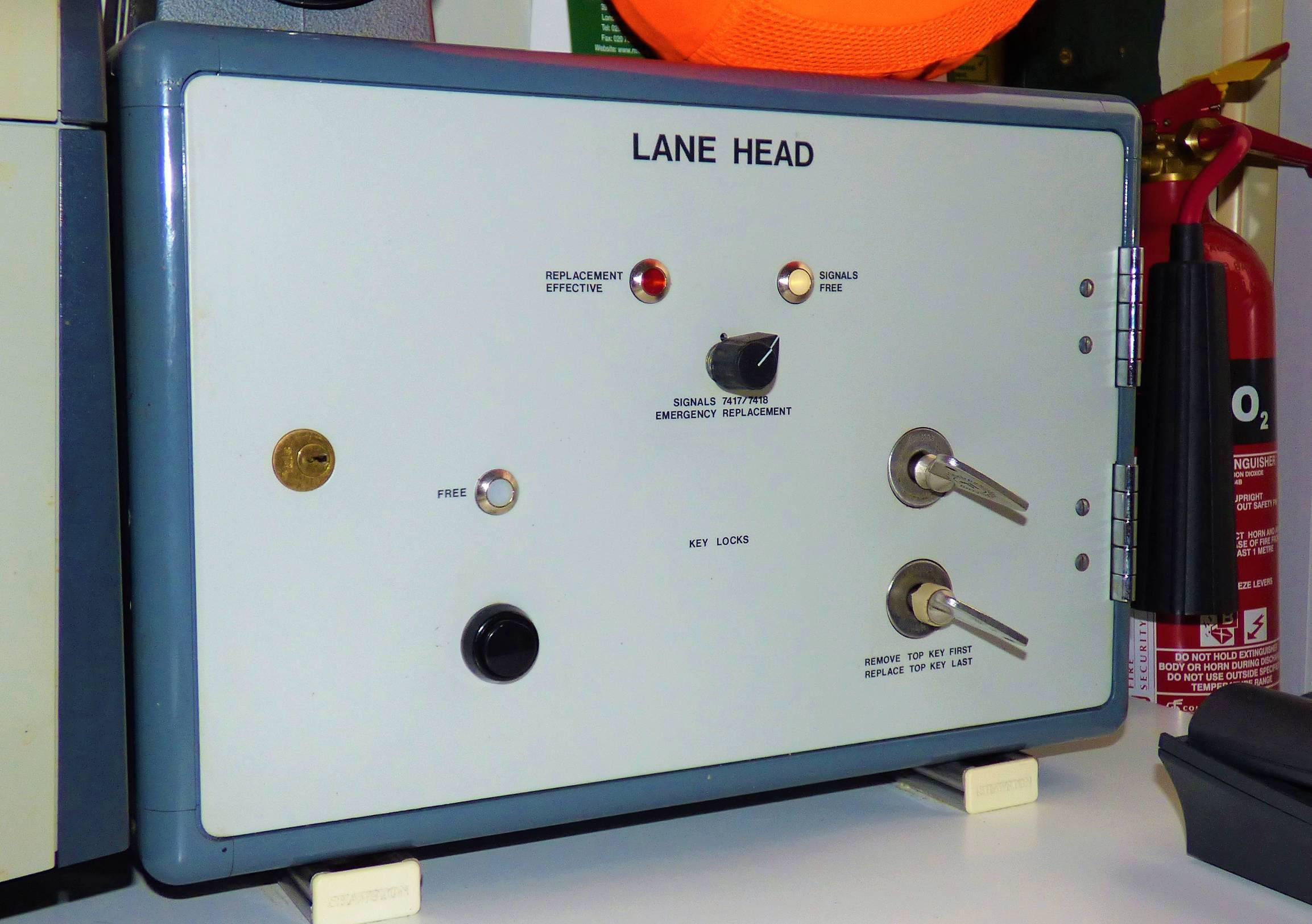 The key lock instrument at Lane Head is visually similar to that at Denton Village, but the method of supervision by Low Row signal box here is very different. If the gates need to be opened for a road vehicle, the Lane Head crossing keeper telephones Low Row and requests the release. Consequently no 'Train Approaching' lights are provided on the Lane Head key lock instrument and there are no 'Train in Section/Train Approaching Section' Absolute Block indicators; the only warning of an approaching train is from the TRUST screen. On the Low Row panel, the Lane Head Key Lock Release switch is usually therefore kept in the Normal position ('cannot open gates') with the 'N' light illuminated and assuming no train is signalled, the 'F' light is illuminated as well.