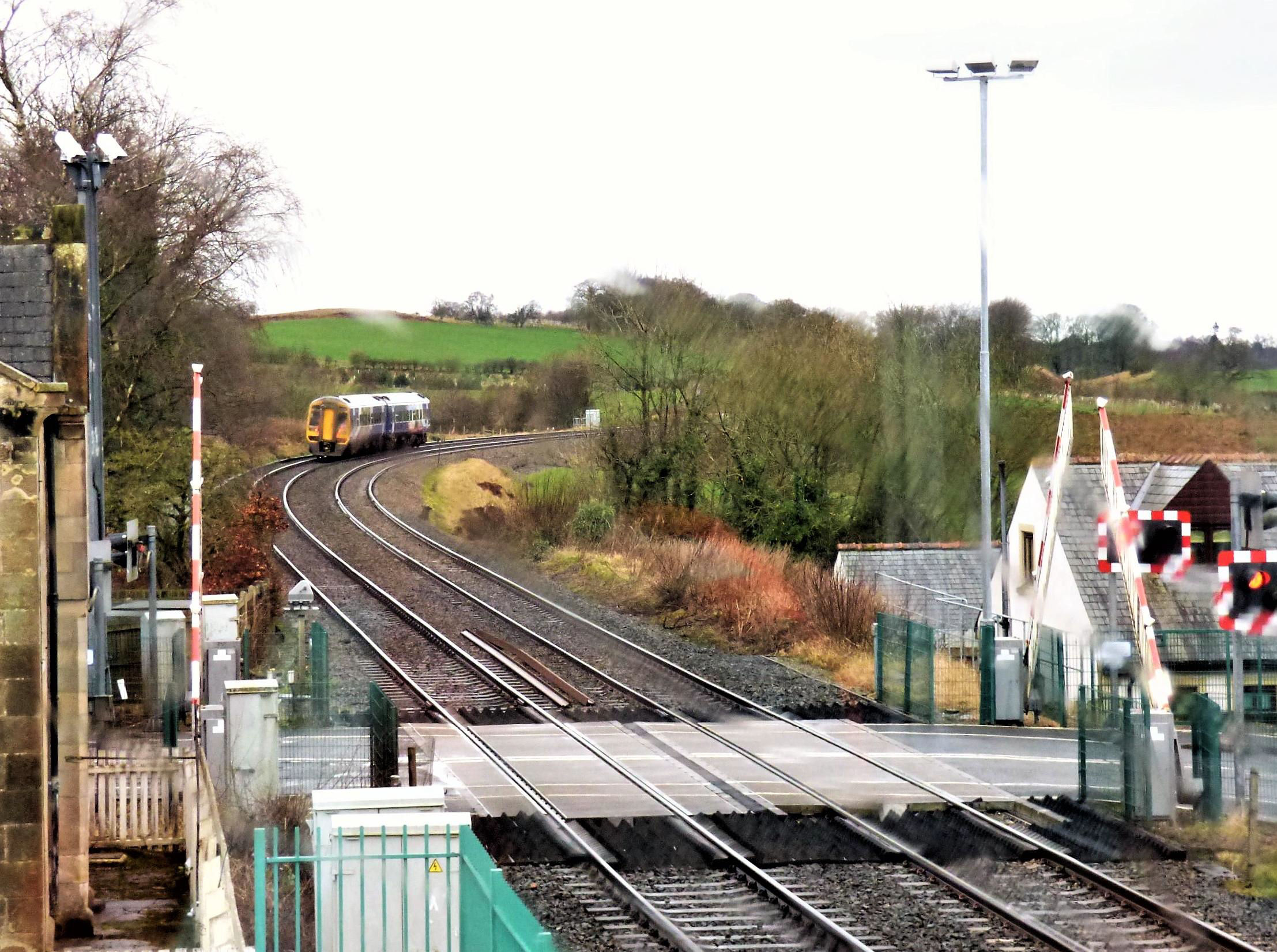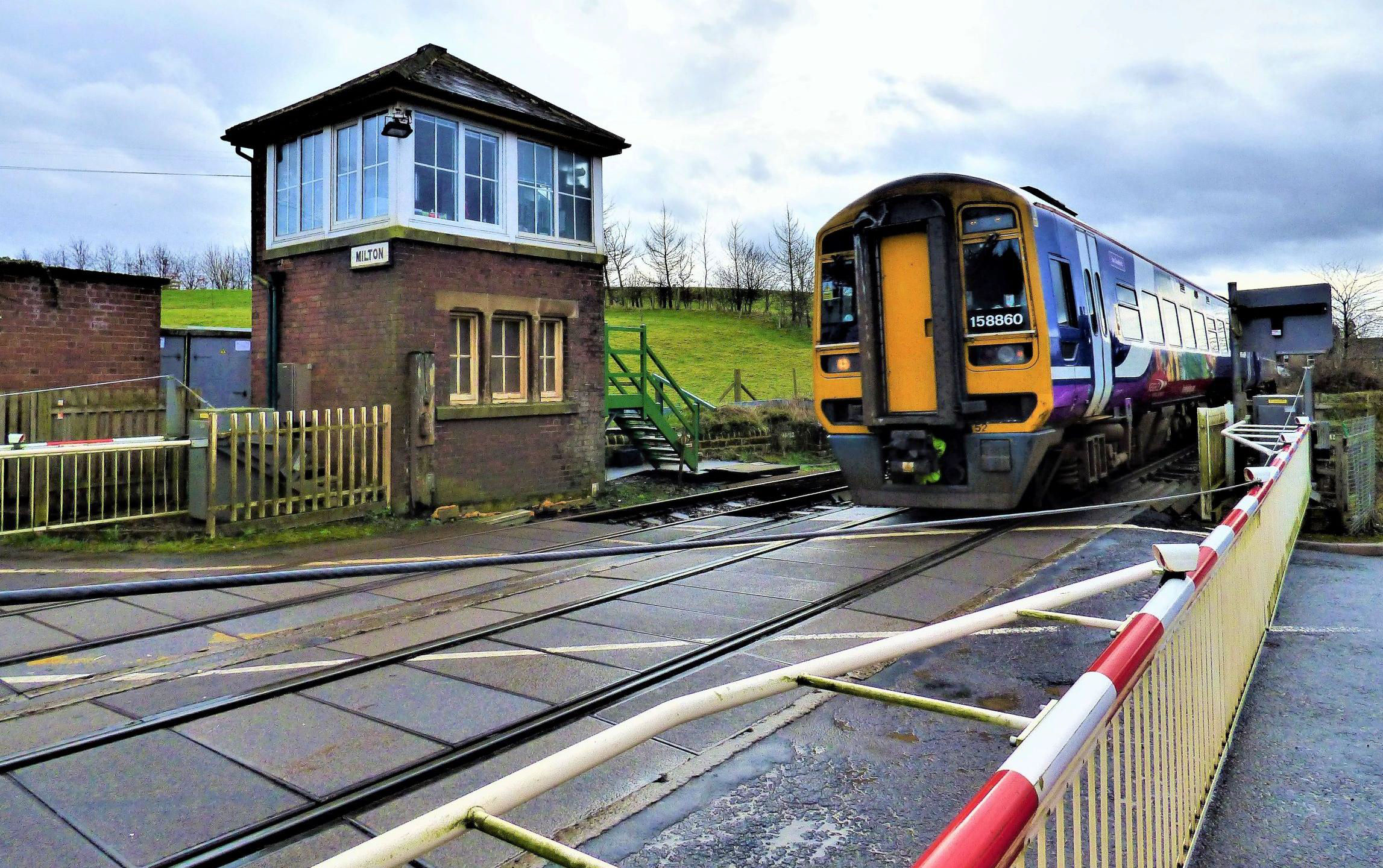 Milton Gate Box is not a Block Post but the bells and block instruments between Low Row and Brampton Fell boxes are repeated here to warn the crossing keeper of approaching trains. Closing the barriers is slightly different to most boxes, as there are warning lights but no warning sirens. The signaller has to keep his finger on the barrier close button and look out for traffic, to close them. The barriers close the road completely. Here 158851 went past on the Down and 158860 on the Up.