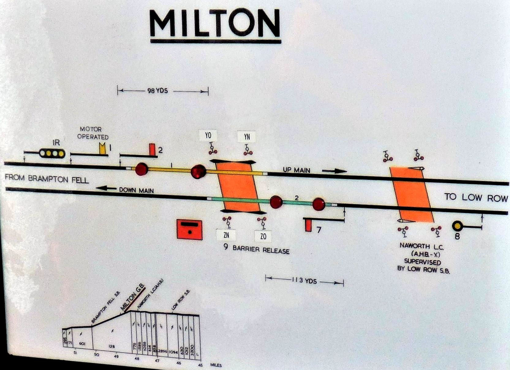 It is doubtful that it was ever a block post. The Up Distant is motor operated and, due to the difficulty in sighting it (because of Brampton station footbridge), the signal was moved in 2003. Previously it was the former Brampton Junction signal box Up Section signal with Milton Gate Box's Distant beneath. The Down Distant is a Colour Light. Both Homes are traditional mechanical signals with arms. In addition Brampton Fell signal box's Up Starting signal (a four-aspect colour light) is restricted to show double yellow when Milton's Up Distant, (at the east end of Brampton station), is at caution. This unusual arrangement is due to the very short distance between Brampton Fell and Milton (to avoid drivers seeing a green on a 4-aspect signal followed almost immediately by a semaphore caution).