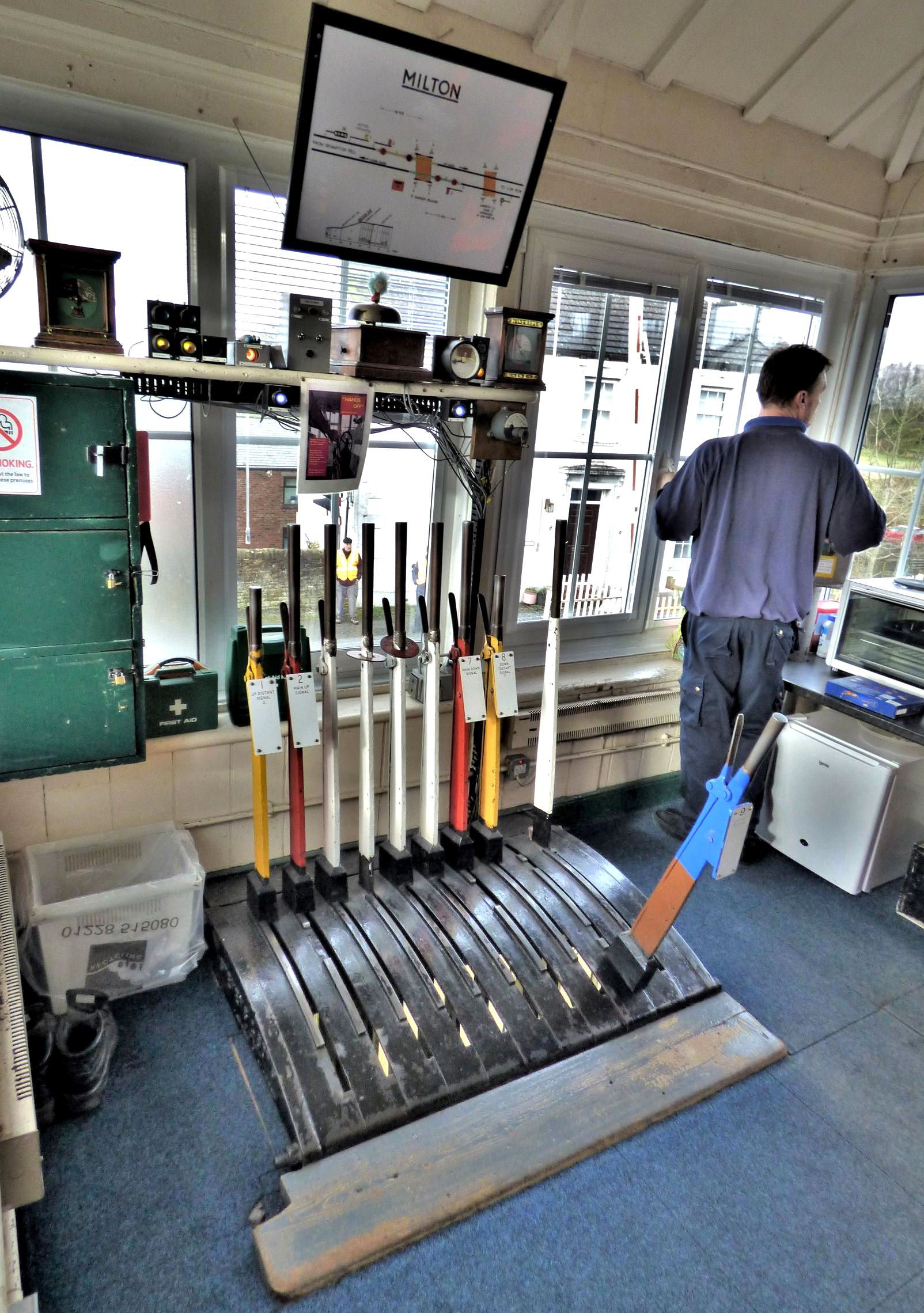 Due to the number of crossings on the line, including Lane Head, and Denton Village, three Automatic Half Barrier Crossings, and various user worked crossings, there is plenty of manual work for the signaller. The Box works Absolute Block to Haltwhistle eastwards and Brampton Fell to the west (Milton, 2½ miles west is only a gate box). It also controls the adjacent full electric Barriered Crossing. The box controls a four aspect signal, unusual for Absolute Block. Block Bells are present in the panel, and are still manually recorded by the signaller. Flags are available to signal trains through the crossing when needed. An annunciator warns of approaching trains on the Down line, towards Carlisle, but the barriers are not lowered immediately as it takes six minutes for a passenger train to reach here.