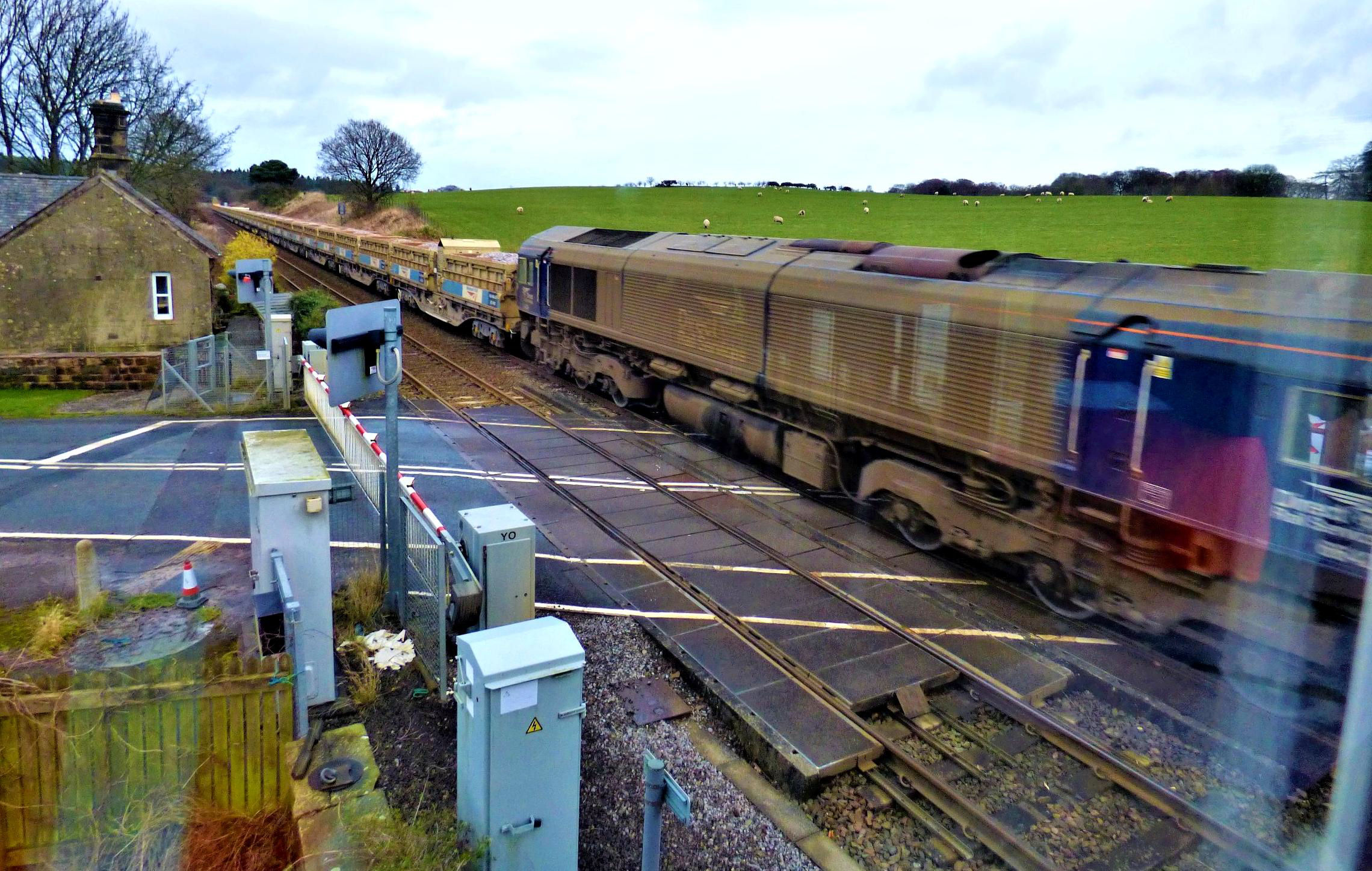 Through the signal box window, 66429 hauling the 11.28 6M10 MWFO (as required) Redcar to Carlisle loaded ballast train at 16.08.