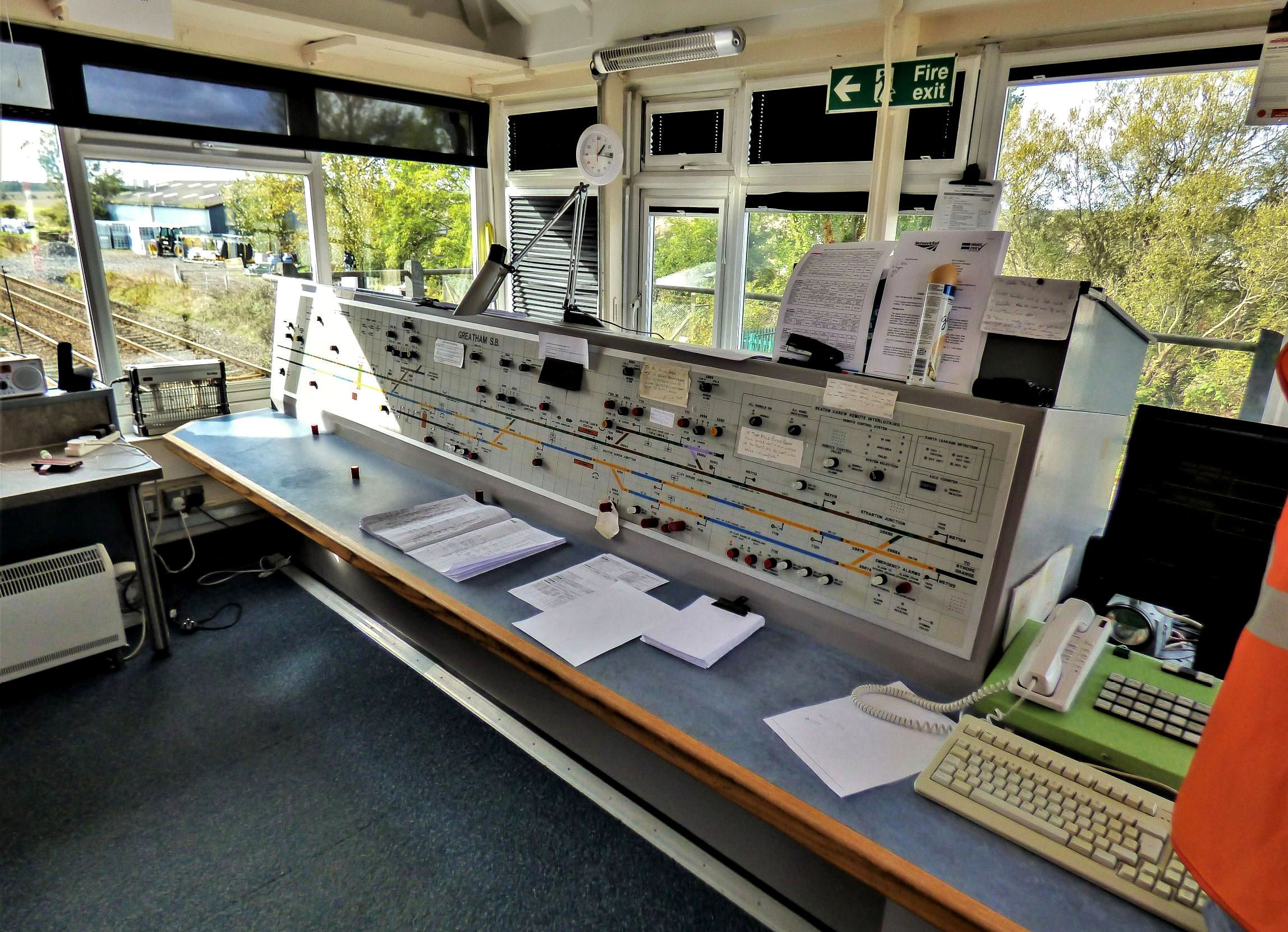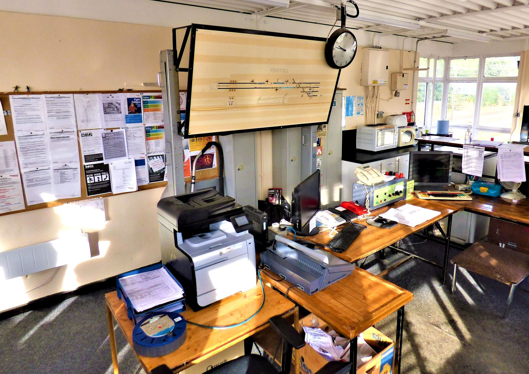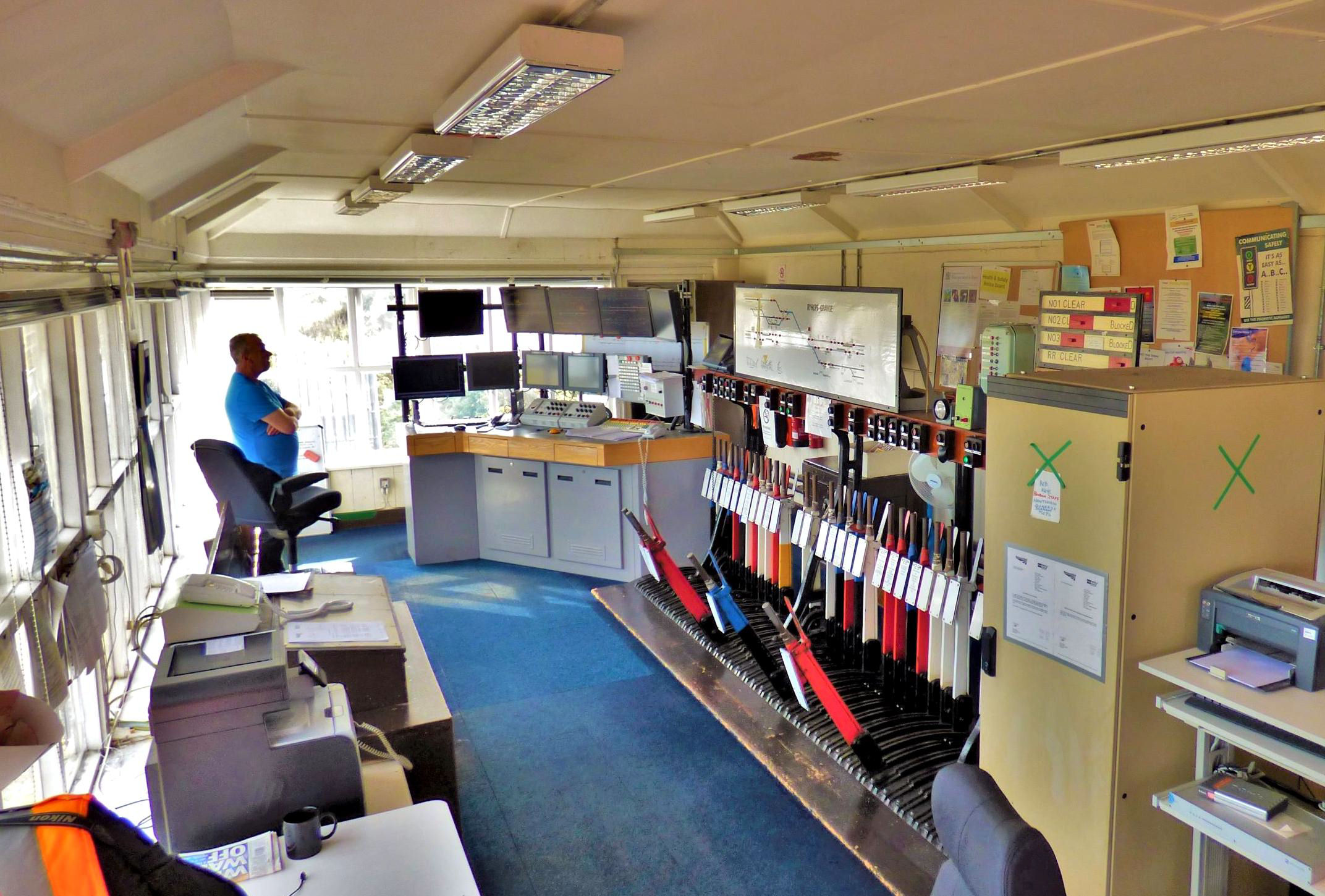 Ryhope Grange Signal Box WestCAD VDU workstation,diagram, lever frame and instruments.