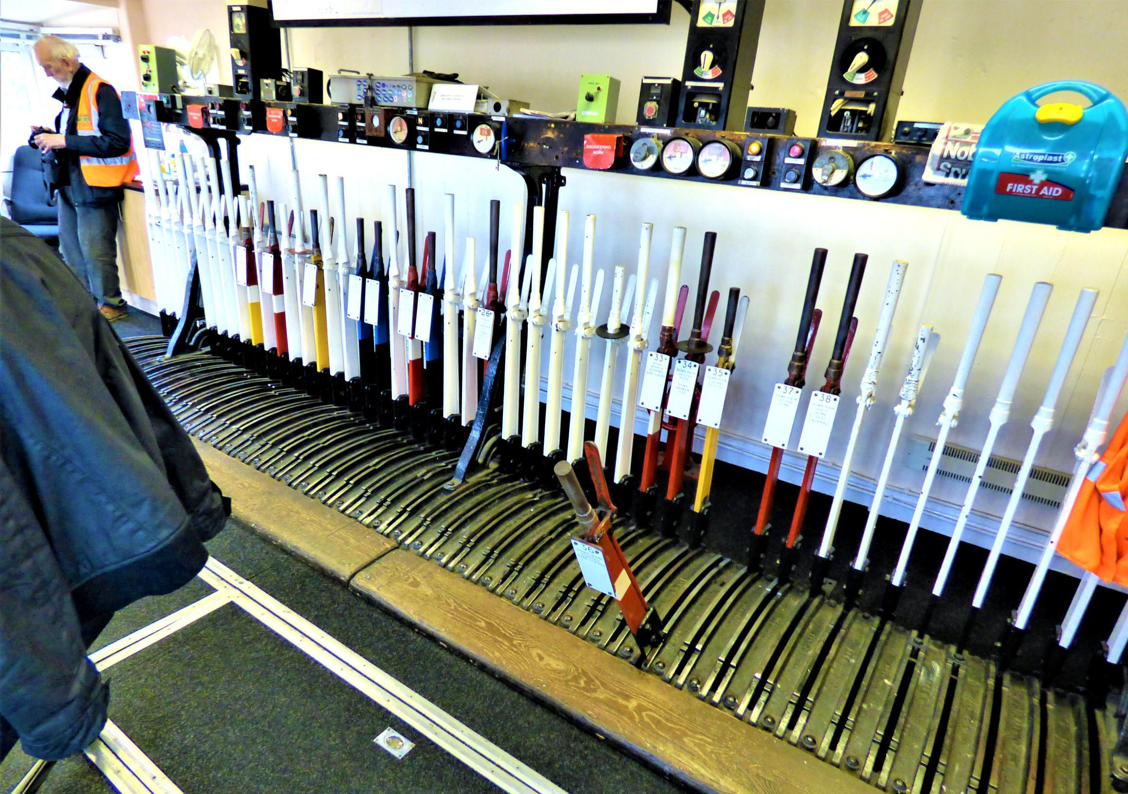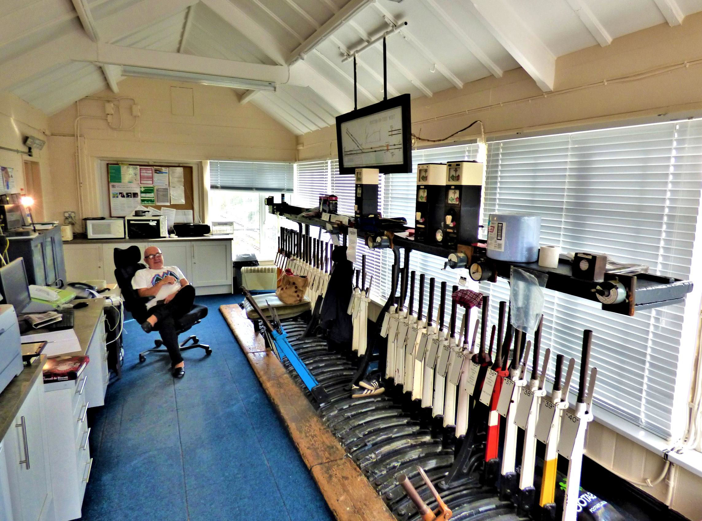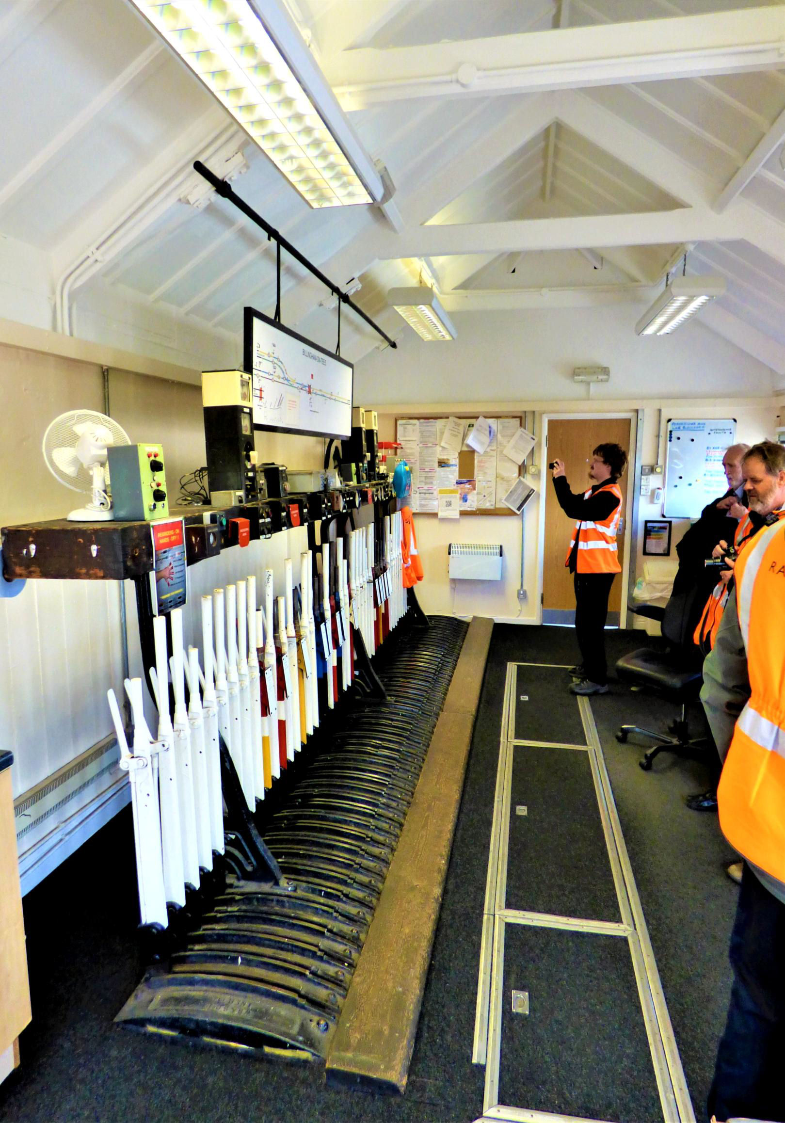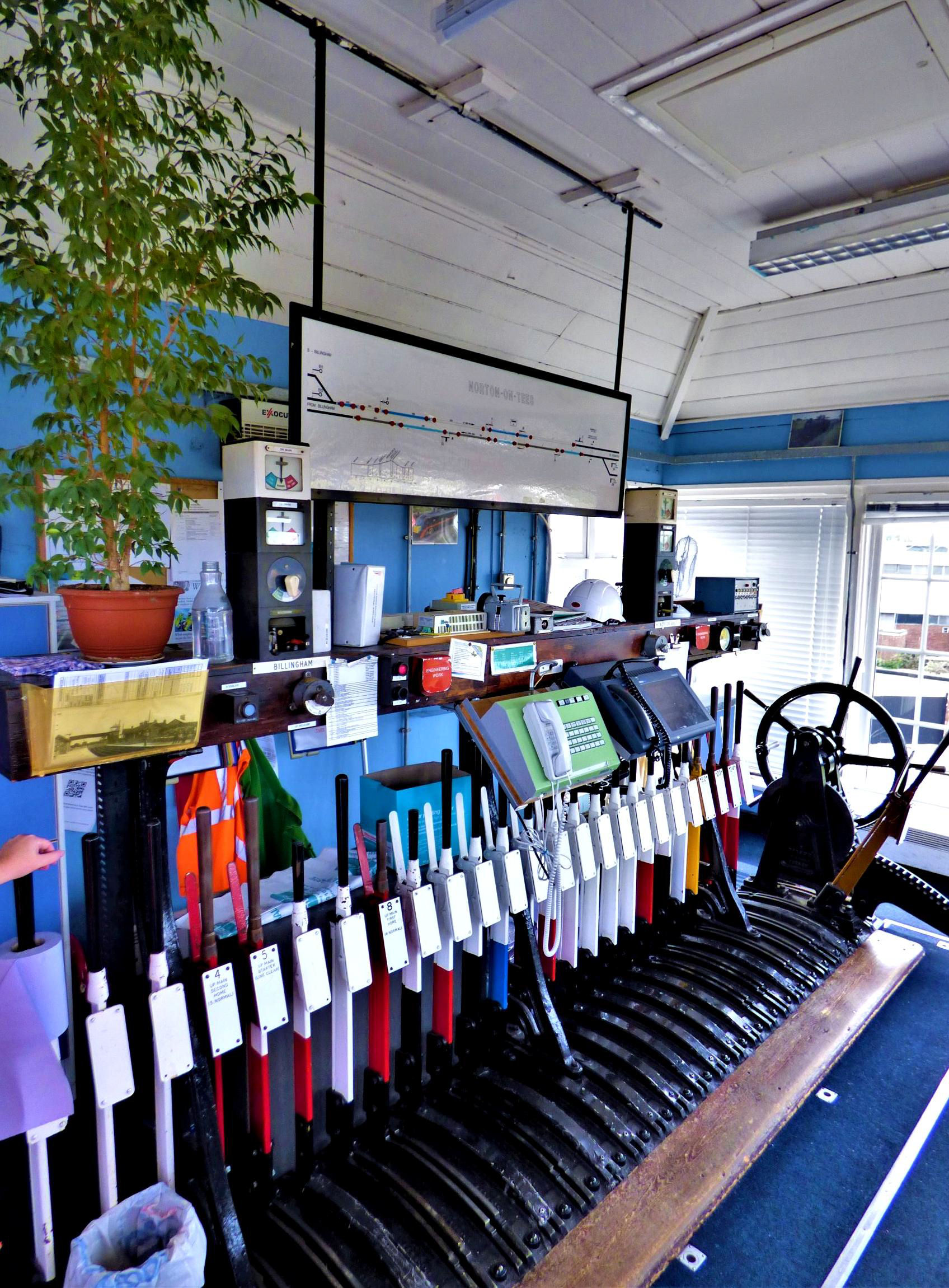 Billingham Signal Box lever frame, diagram and instruments.