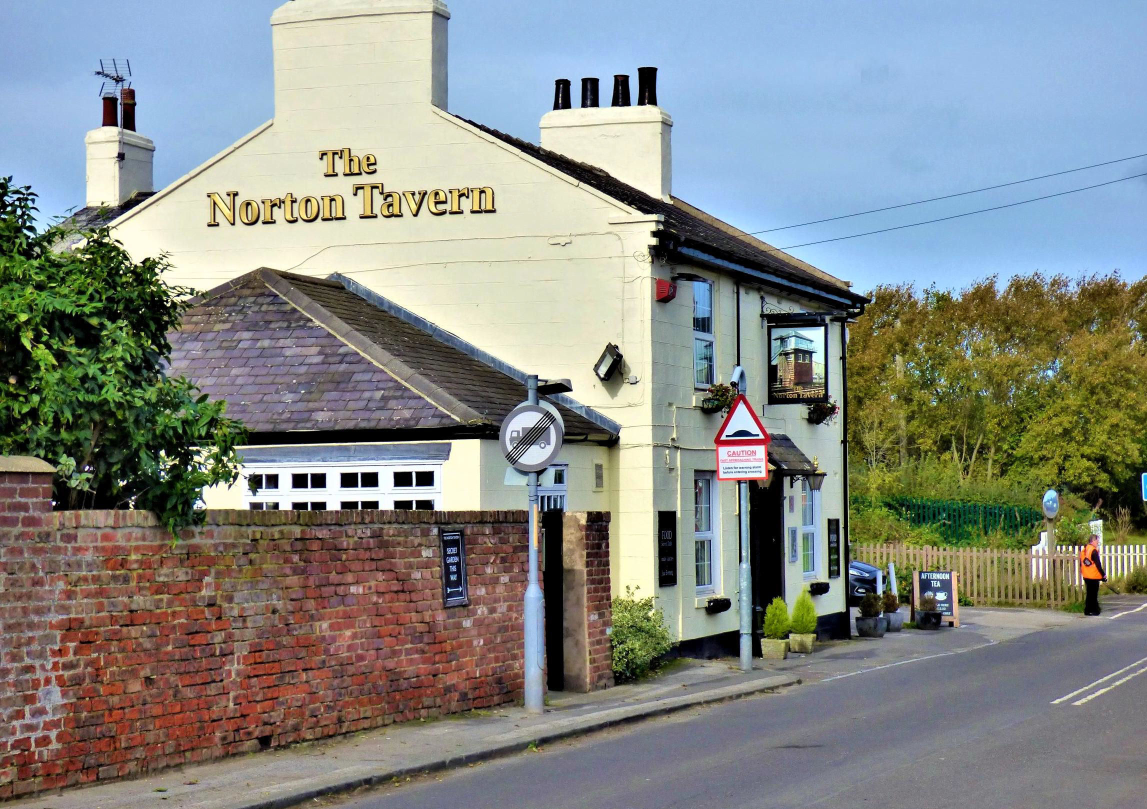 Norton Tavern opposite the box showing its pub sign