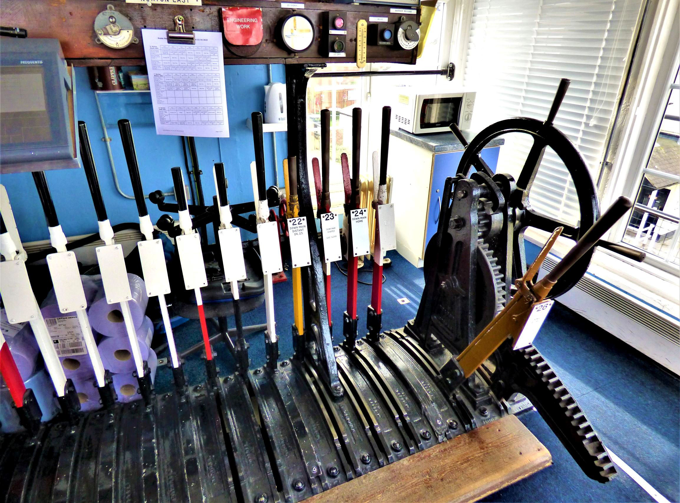 Norton-on-Tees Signal Box lever frame, diagram and instruments.