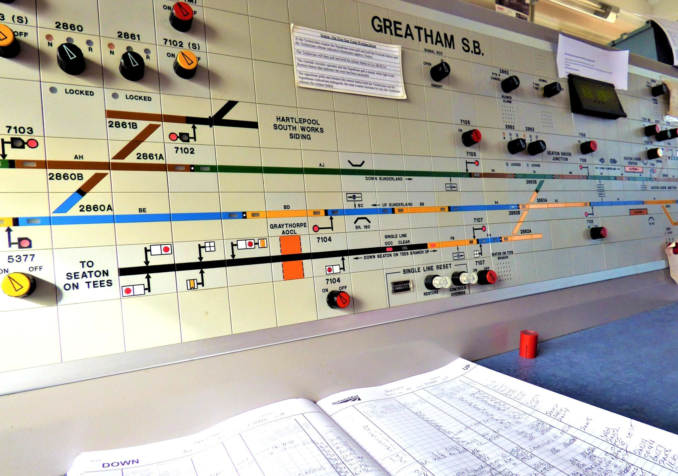 Incredibly our visit coincided with the weekly Seaton-on-Tees flask train. We observed its progress on the panel as it was signalled from the branch to the Down Sunderland before crossing back to the Up Sunderland and passing the box a few minutes later. There is a daily path (SSuX) from and back to Carlisle Kingmoor Yard but it normally runs on Wednesdays (booked at Seaton from 11.05 to 13.40).