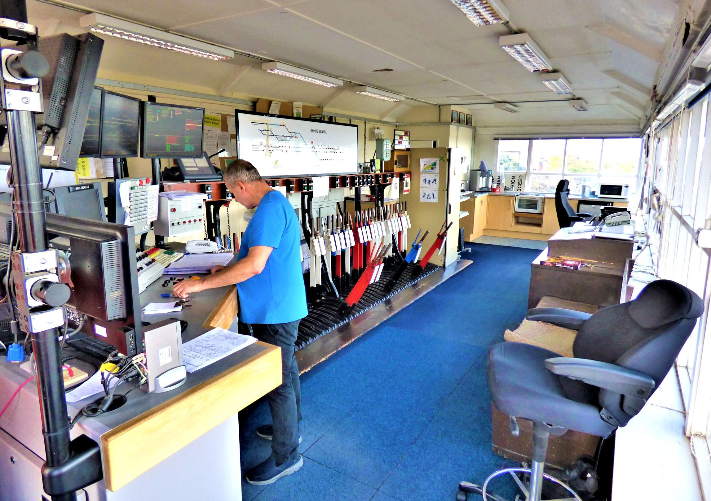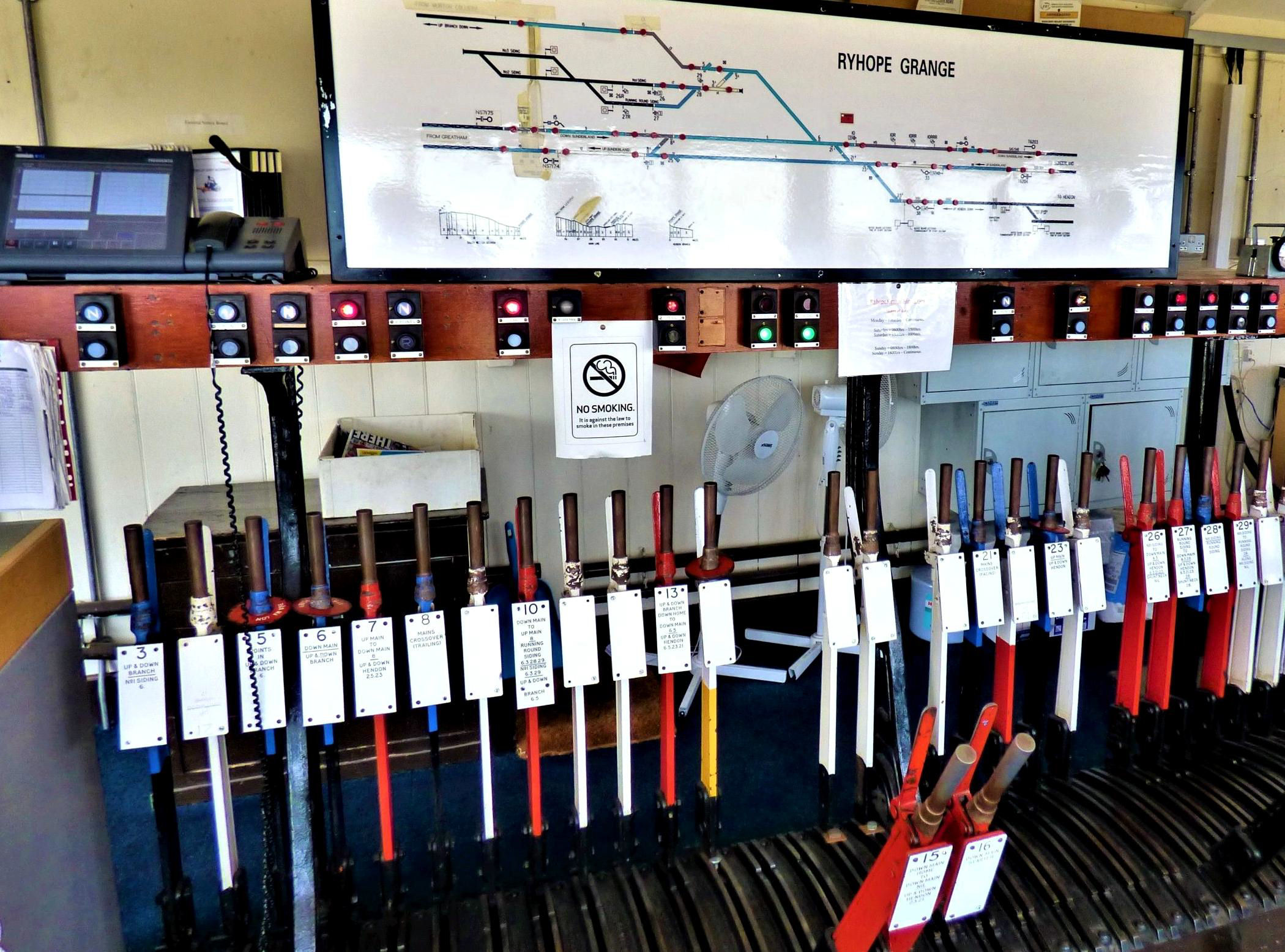 The levers at Ryhope Grange were numbered 3 to 40 (with lever No19 missing) and 18 were still in use (40 originally). Levers 1 & 2 were removed in 2010 to make room for the workstation following closure of the other Durham Coast boxes. Ryhope Grange interfaced with Greatham box at about MP 71, just south of Hartlepool, and with Tyneside Integrated Electronic Control Centre to the north at about MP 88½, both Track Circuit Block. Hall Dene (north of Seaham) and Church Street (south of Hartlepool) level crossing barriers were also remotely controlled and monitored via CCTV from Ryhope Grange.