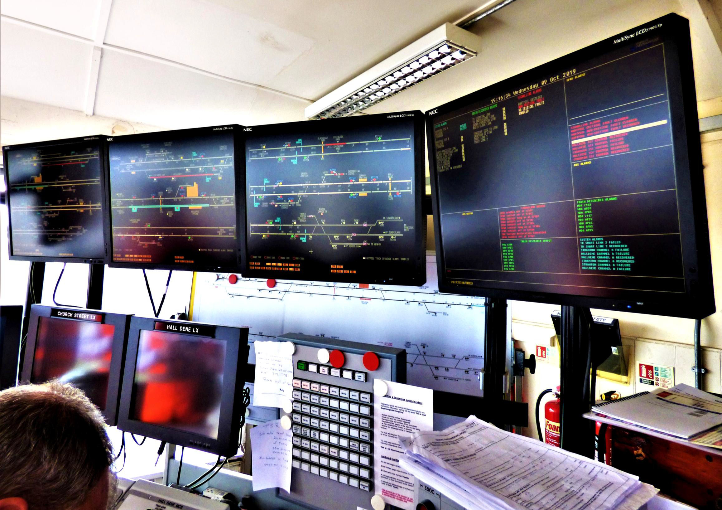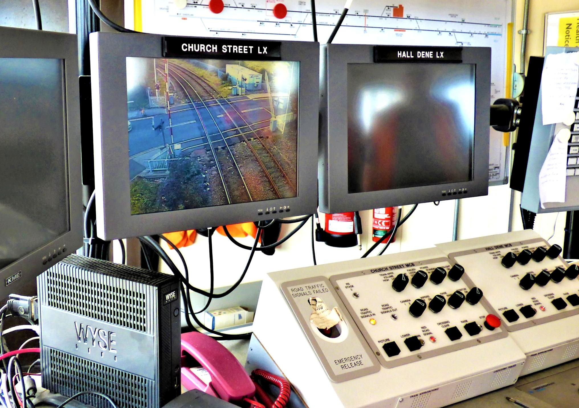 Ryhope Grange Signal Box Church Street and Hall Dene level crossing monitors and controls.