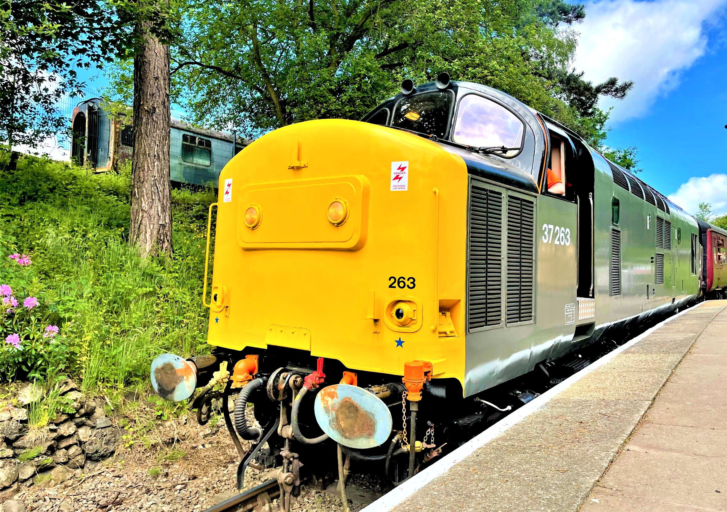 I reached Telford before 09.30 for the 10.30 start and already it looked as though the whole train full had arrived. The weather was scorching (not quite 37o!), the '37' parked on the buffers end at Spring Village (TRACKmaps 4 p22E 2018) looked resplendent in grey, absolutely superb, with the '08' out of sight on the other end. For social distancing and boarding ease, as the train was four coaches long, we were all ushered to the lengthier Horsehay & Dawley platform some 100 yards up the road.