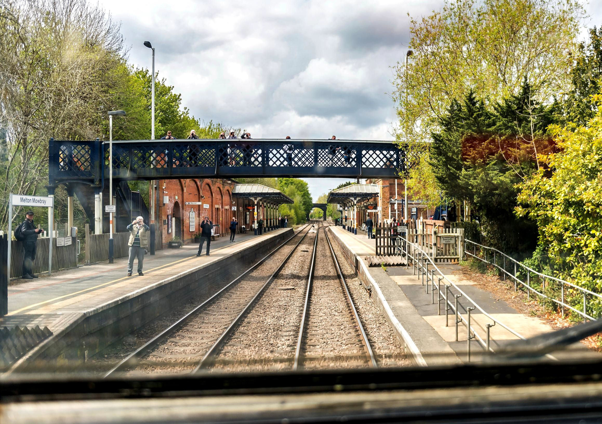 Traversing the non-platform, non-electrified, Down line at Corby (not used by diversions as they all call at the single platform on the Up side in place of the normal service), it was then off through the countryside at a more leisurely pace (60mph line speed). There were many photographers in the fields as we admired the views from the brick built Harringworth Viaduct (over 20,000,000 of them in the 82 arch, ¾ mile long, 57ft tall spectacular structure). The slowing for the 40mph at Manton Jn is not so noticeable these days since it was restored from a single lead to a full junction in Sep 2013. Oakham signal box, at the start of the four track section to Langham Jn, still looks like the Airfix model it is based on (or maybe vice versa). Curving round at Syston we rejoined the main line but now pointing towards London and a few minutes early. We were then passed by a southbound Meridian which we were to follow into Leicester, so those few minutes were lost again as we waited for it to clear.