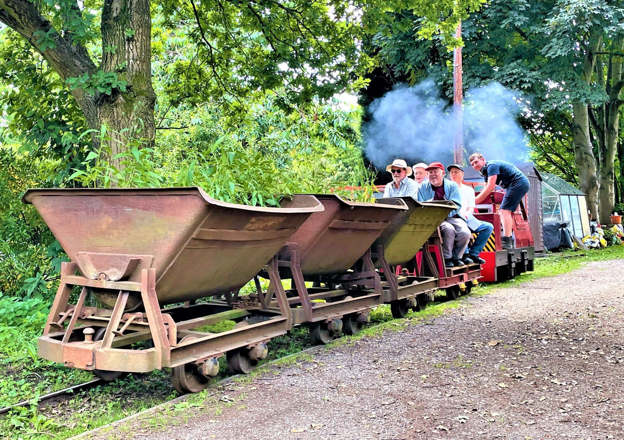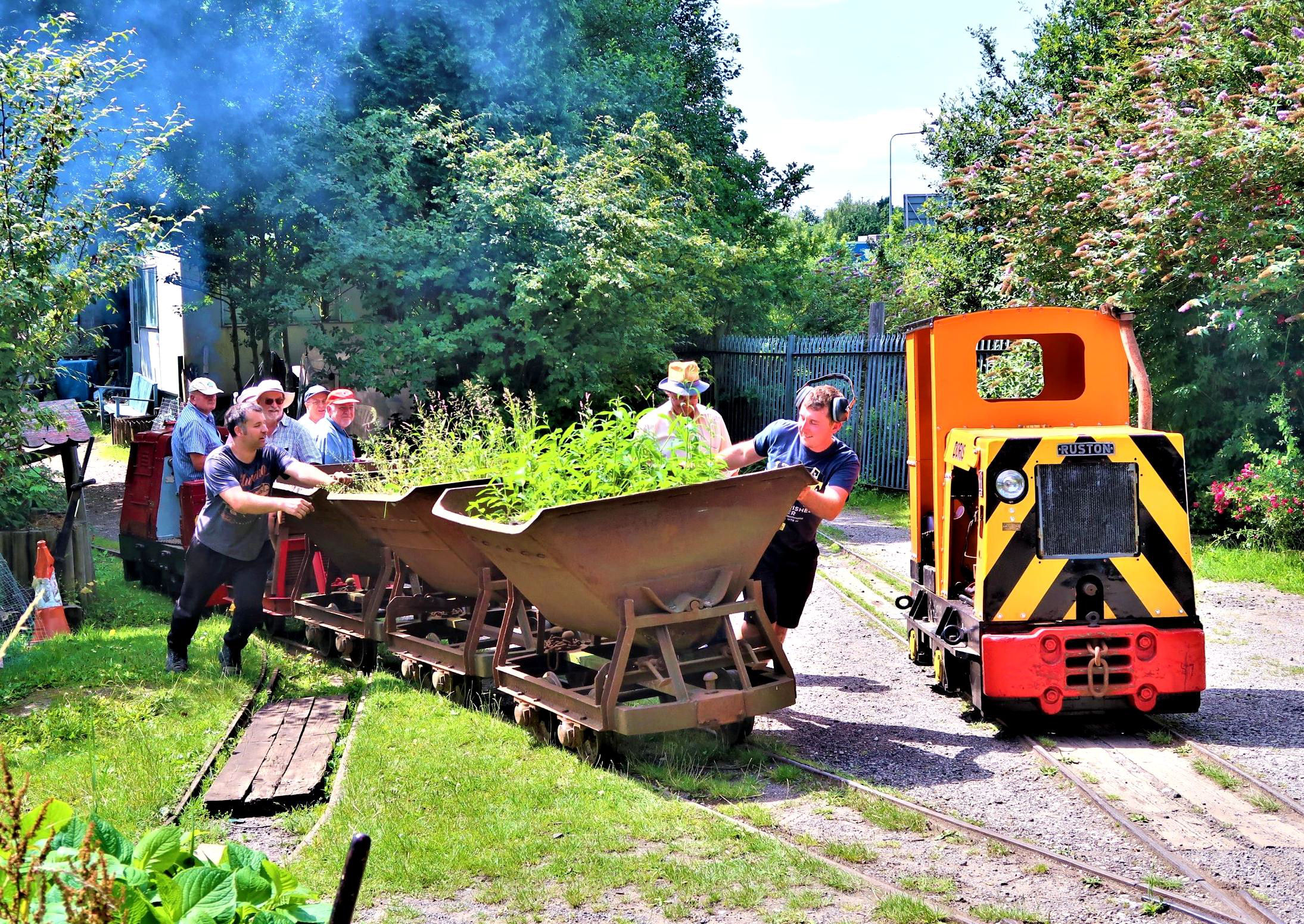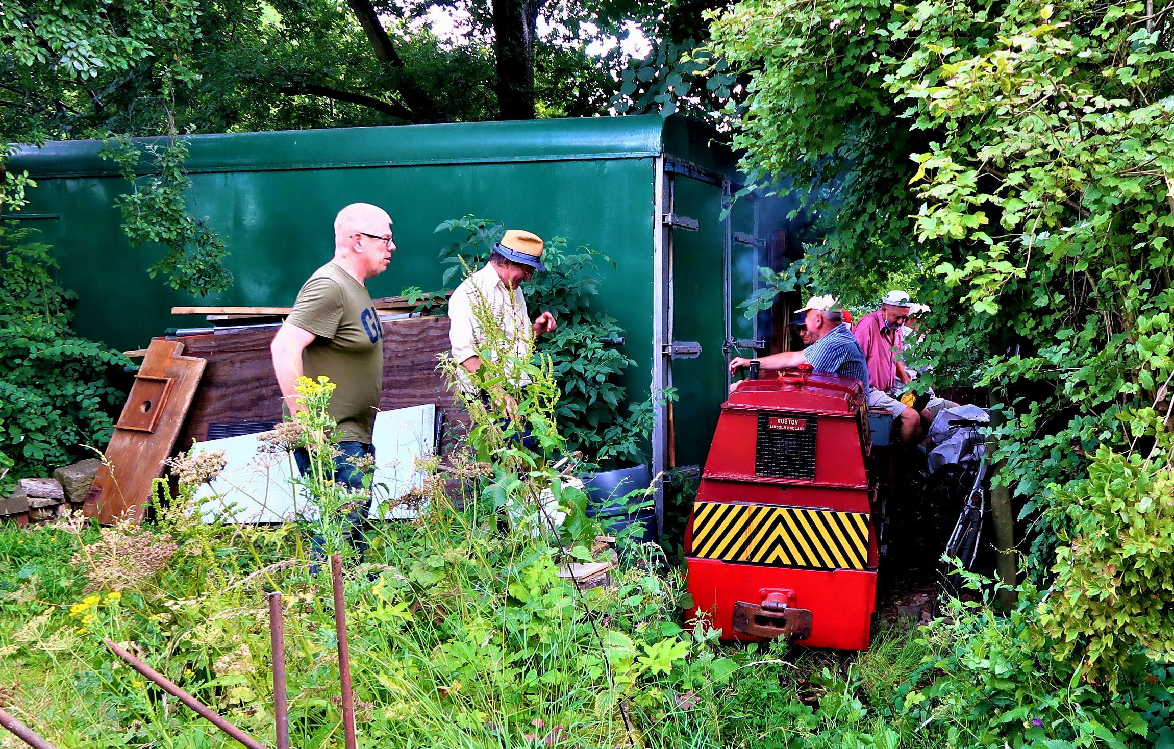On its second trip, 'Doris' took some hoppers full of soil and plants, (horticultural not industrial) left in the large shed, to clear one of the sidings. Meanwhile, the maroon loco ran between a siding quickly dubbed by those present as 'the nettle siding' (quite unfortunate for those in shorts or a miniskirt!), and the siding next to the top shed, also running over the connection onto the 'main' line for vital overlap. Knees had to be tucked right in, as the clearances were very tight! Everyone was able to quite efficiently do all the track at the top end have a good run down to the bottom of the line and back.