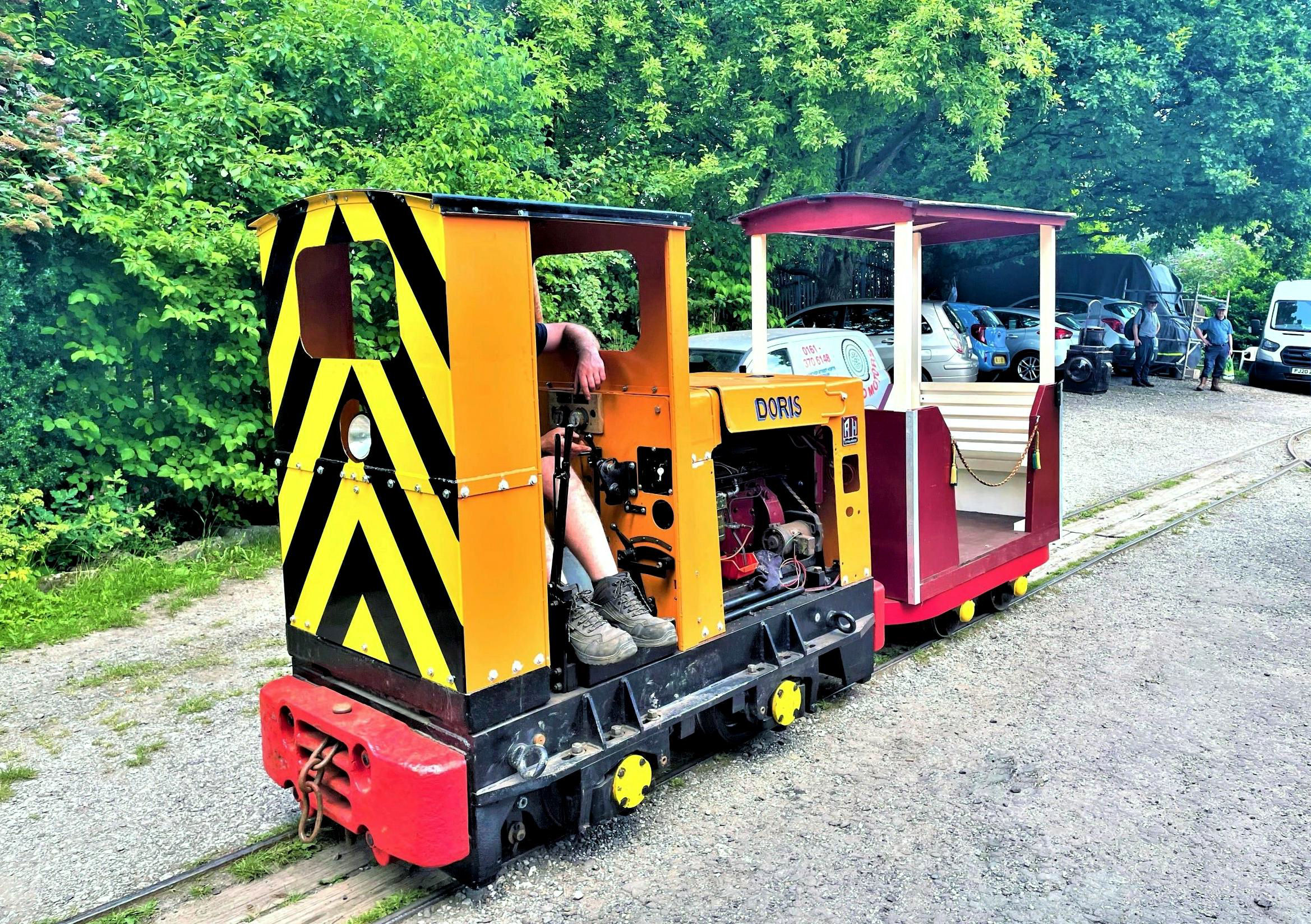 The locos all disappeared back down hill to fetch the coaches. After a safety briefing, back up the hill arrived: MR8905 'Charlotte', a green 4-wheeled diesel mechanical hauling a large covered coach with four loose kitchen seats, a (working!) clock, and a bell which rang when the coach went over a bump. RH200761, a maroon 4-wheeled diesel mechanical brought an open carriage with a pair of back to back longitudinal benches seating four and RH418776 'Doris', an orange 4-wheeled diesel mechanical, was on a covered coach with two small transverse benches; each could just about seat two people.