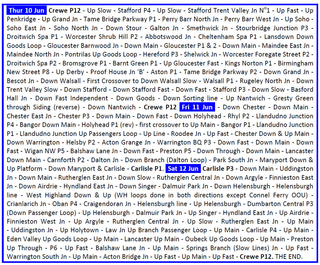 We returned to the station to pick up our passengers and proceeded, most unusually, non-stop through Ledbury (a first for a member who had used the line regularly since 1964), passing BLN HQ on the right at Great Malvern and Bromsgrove to tackle the Lickey Incline. Our route took us via Birmingham New Street (did we set the fire alarms off?), Walsall and Rugeley - the line between Walsall and Rugeley has only had electric trains since May 2019. We then did the connection now rarely used by passenger trains, I'm advised, from Rugeley Trent Valley P1 to Rugeley North Jn, joining the West Coast Main Line for our journey via Stafford and back into Crewe. After our passengers had alighted, a thorough clean was completed prior to stewards leaving at the Depot. Following issues surrounding the generator car on the train, 47712 joined it at the depot to cool the set overnight. A quick walk to the hotel ended Thursday.