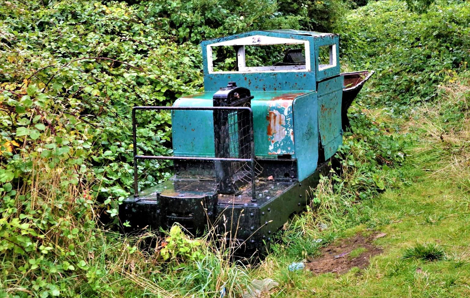 Remains of 4wDM No24 with a tipper wagon on a remnant of the disconnected Chamberlain Barn's sand quarry branch.