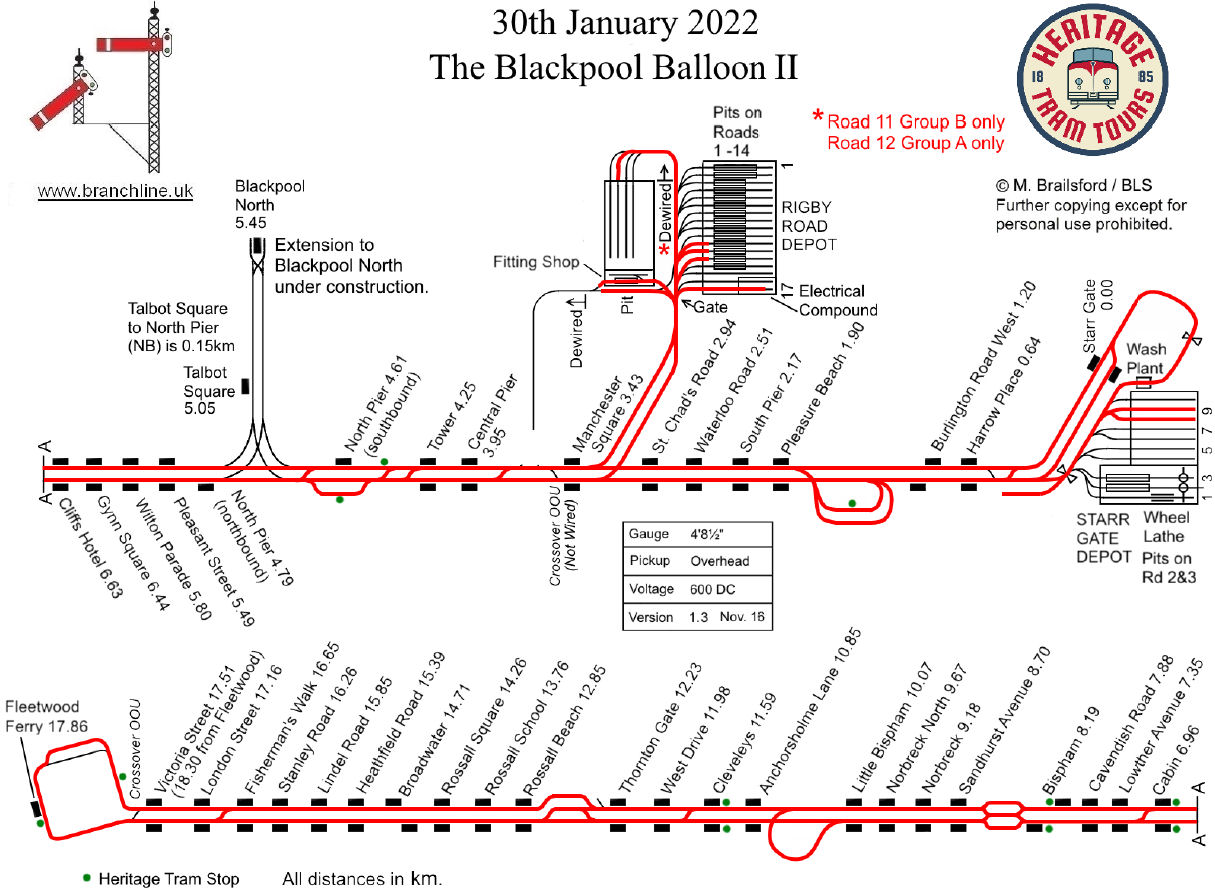 My thanks go to all our Society personnel, led by Kev Adlam, involved with this, well-organised, well- executed and comprehensive tour of the 11-mile system. Not least, thanks to those who prepared the invaluable stocklist and track plan (as always, it was so useful to have these in advance) and also the special ticket: 'From Rigby Road to Fleetwood, Route: Unusual' - yes, indeed! PS: It was good to be able to purchase from the on-tram-staff BHT's fine Blackpool Heritage Trams! booklet on the day (see: https://heritagetramtours.square.site/ excellent value at £5, and a significant exclamation mark).