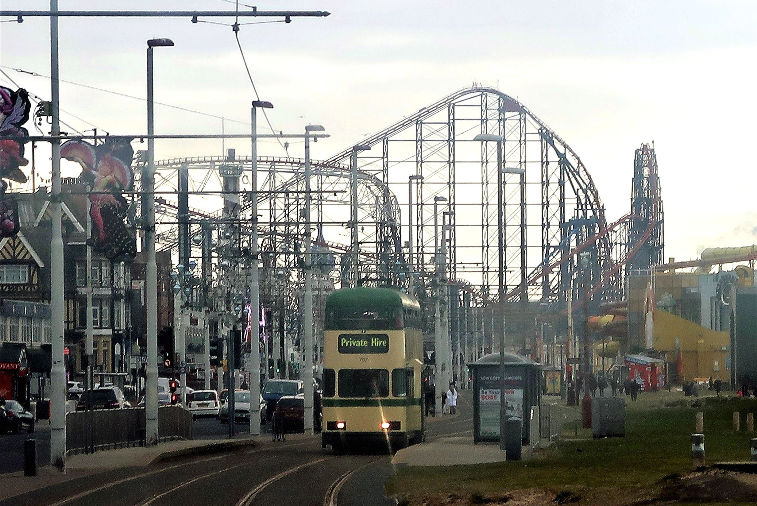South Pier (taken through tram window), the 'Big One' rollercoaster (the UK's tallest) is closed for maintenance.