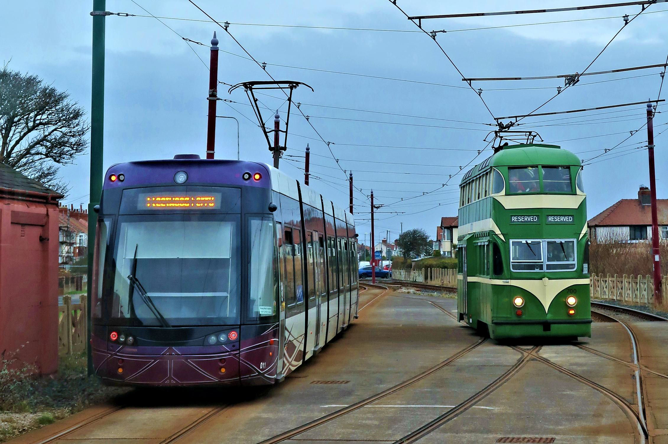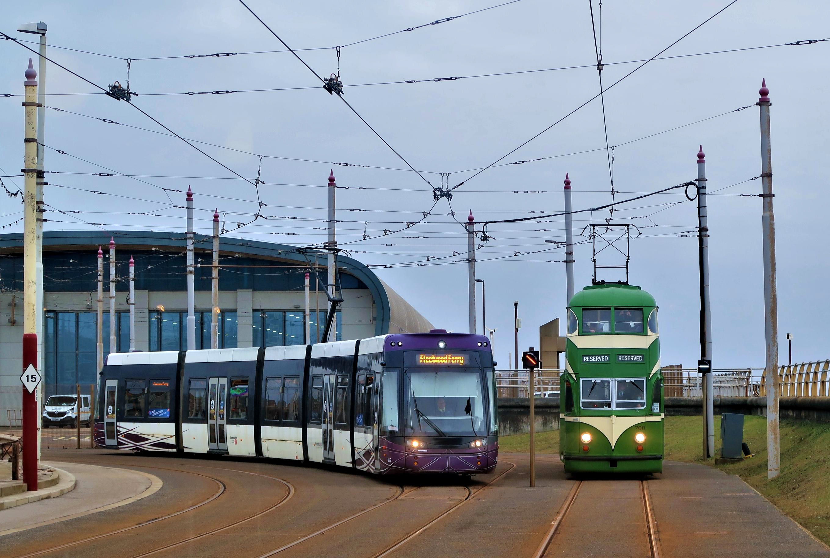 With Starr Gate tram depot in the background, a modern tram leaves for Fleetwood Ferry passing our tour trams in the depot headshunt.